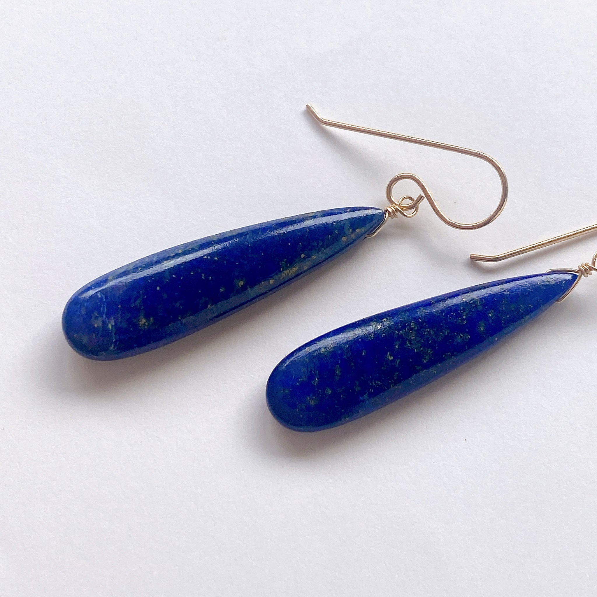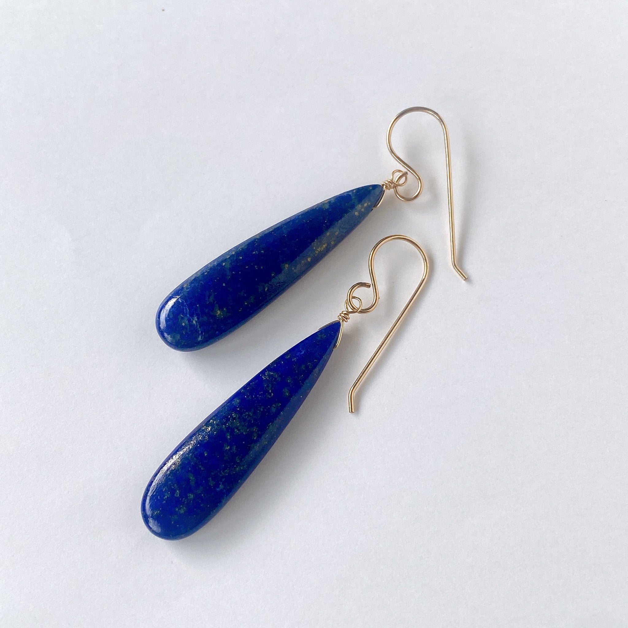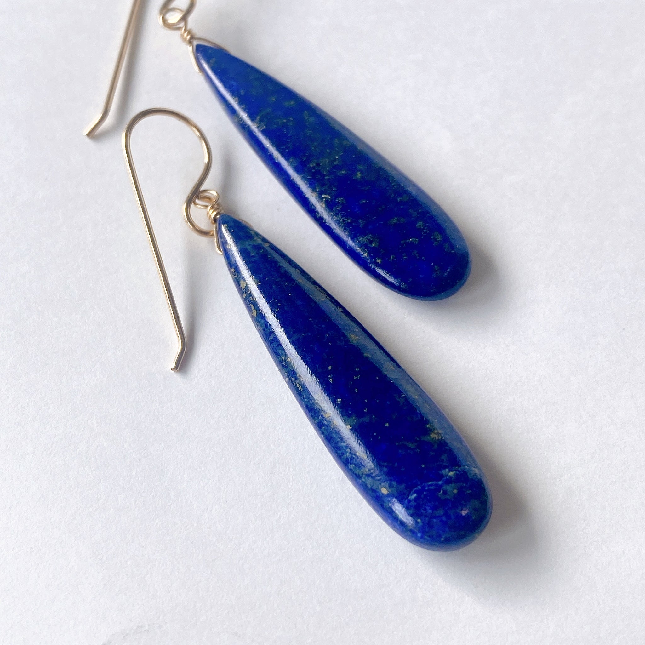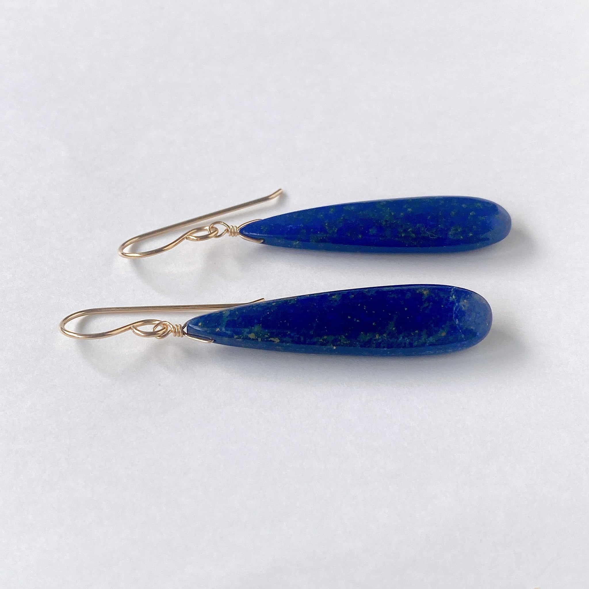 ロングペアシェイプカットのラピスラズリを使ってデザインした耳飾りです。