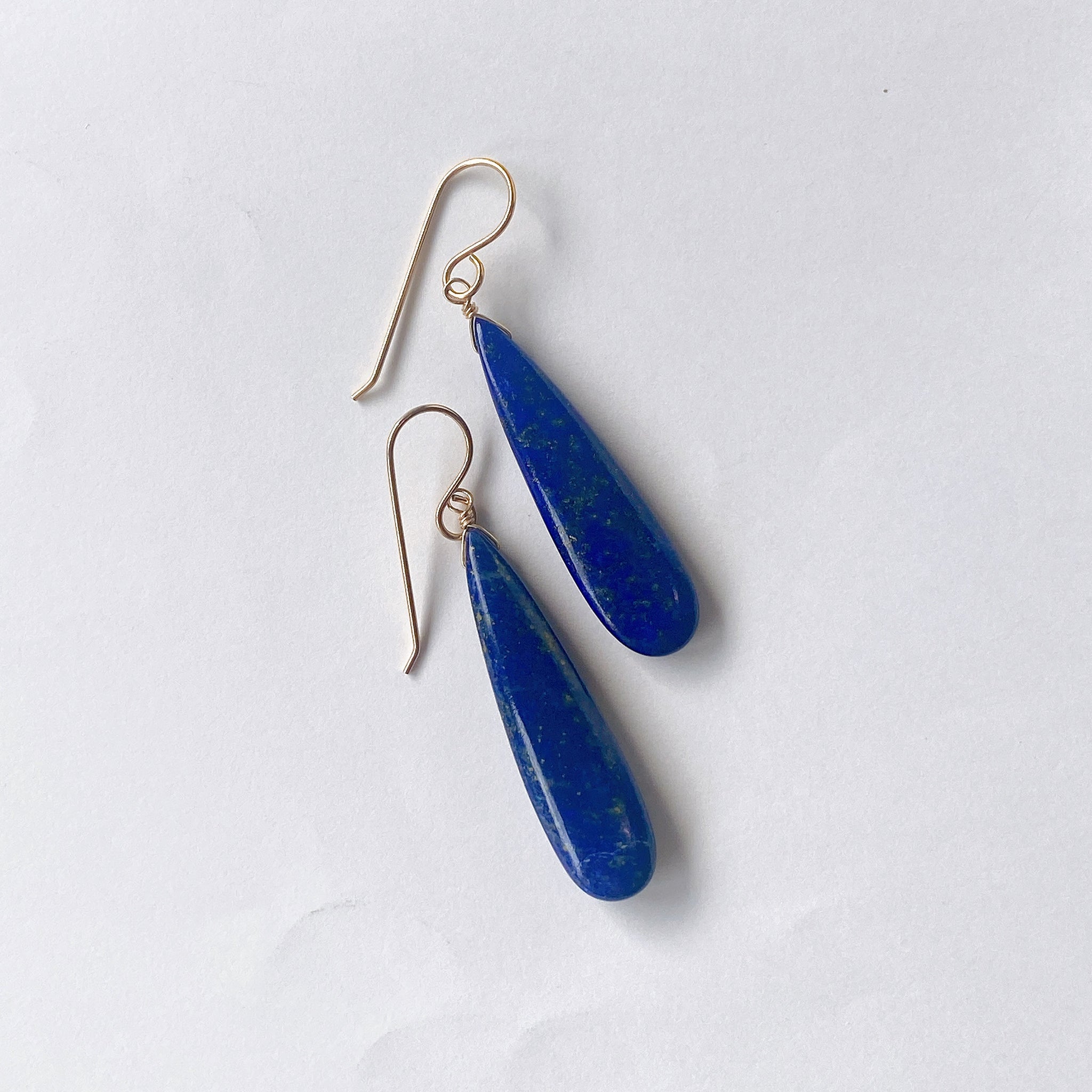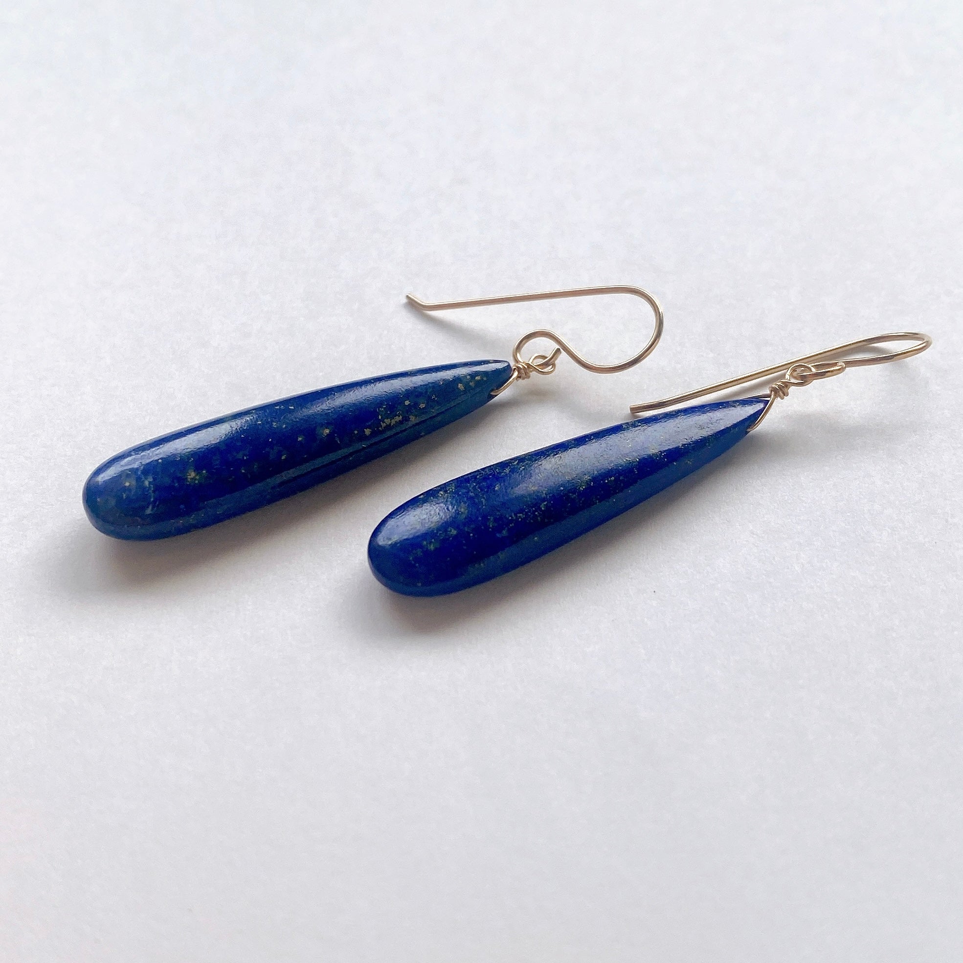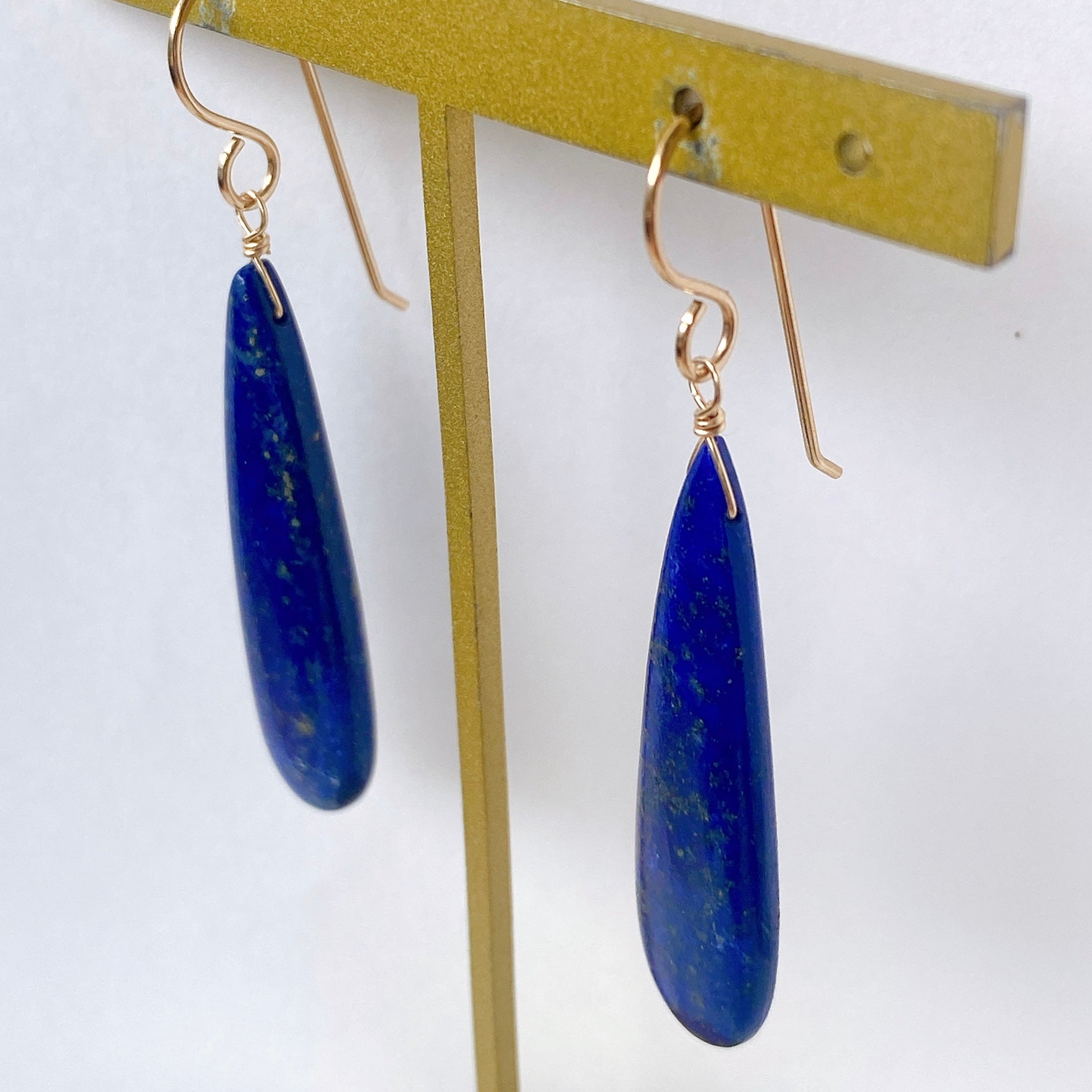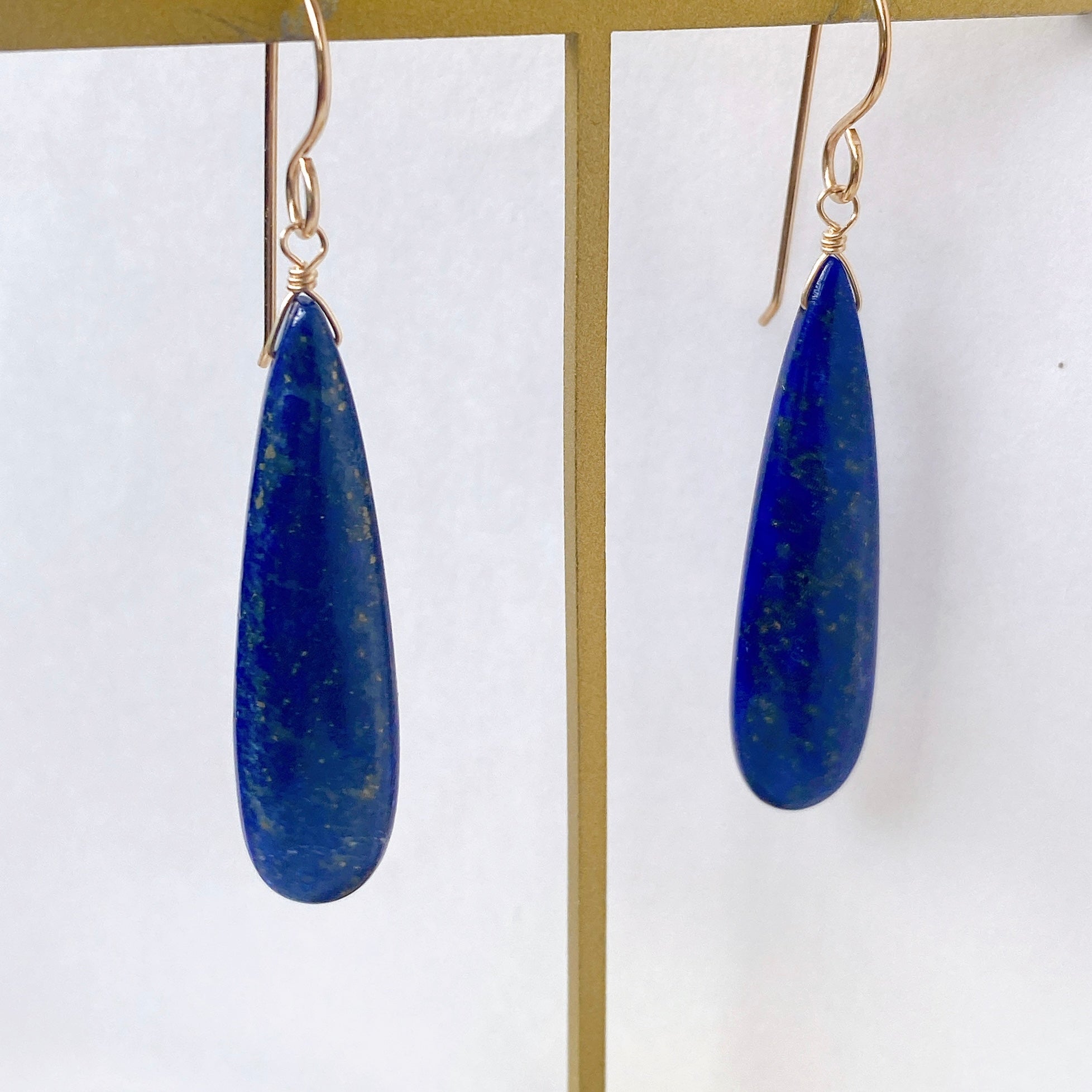 ロングペアシェイプカットのラピスラズリを使ってデザインした耳飾りです。