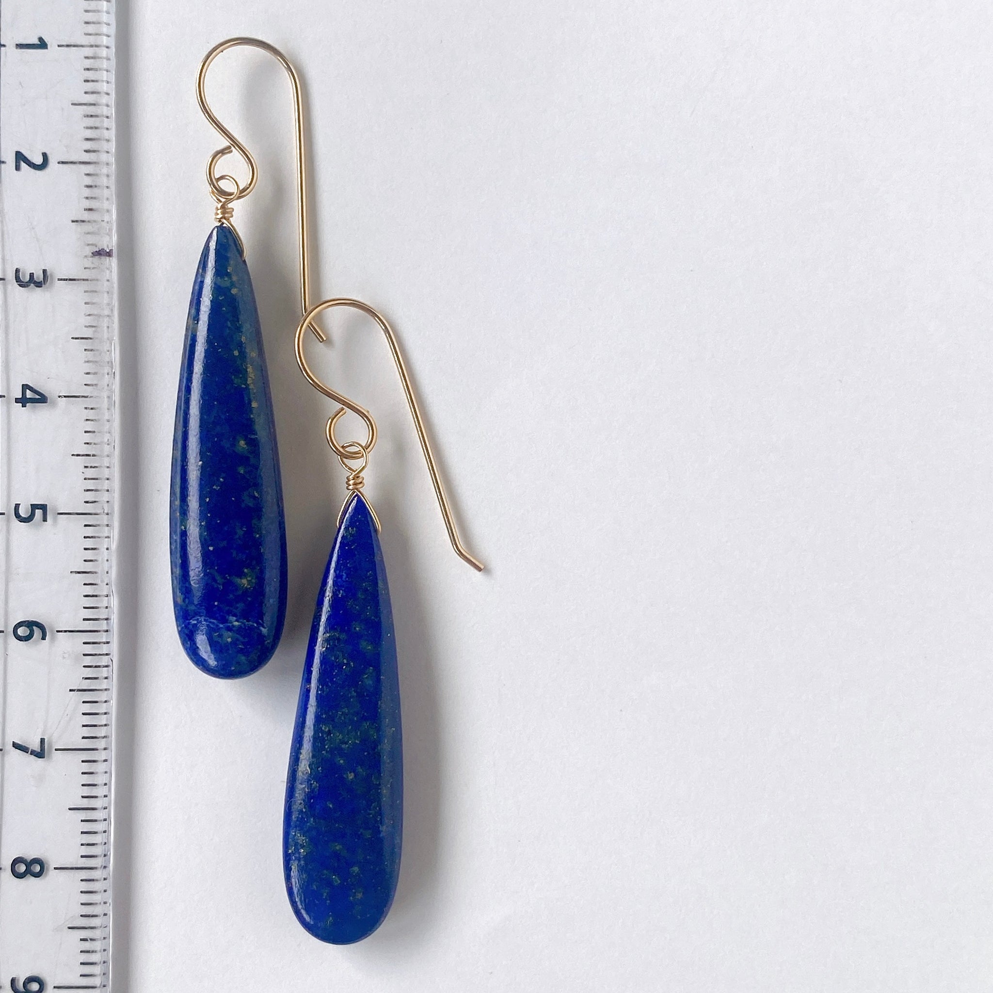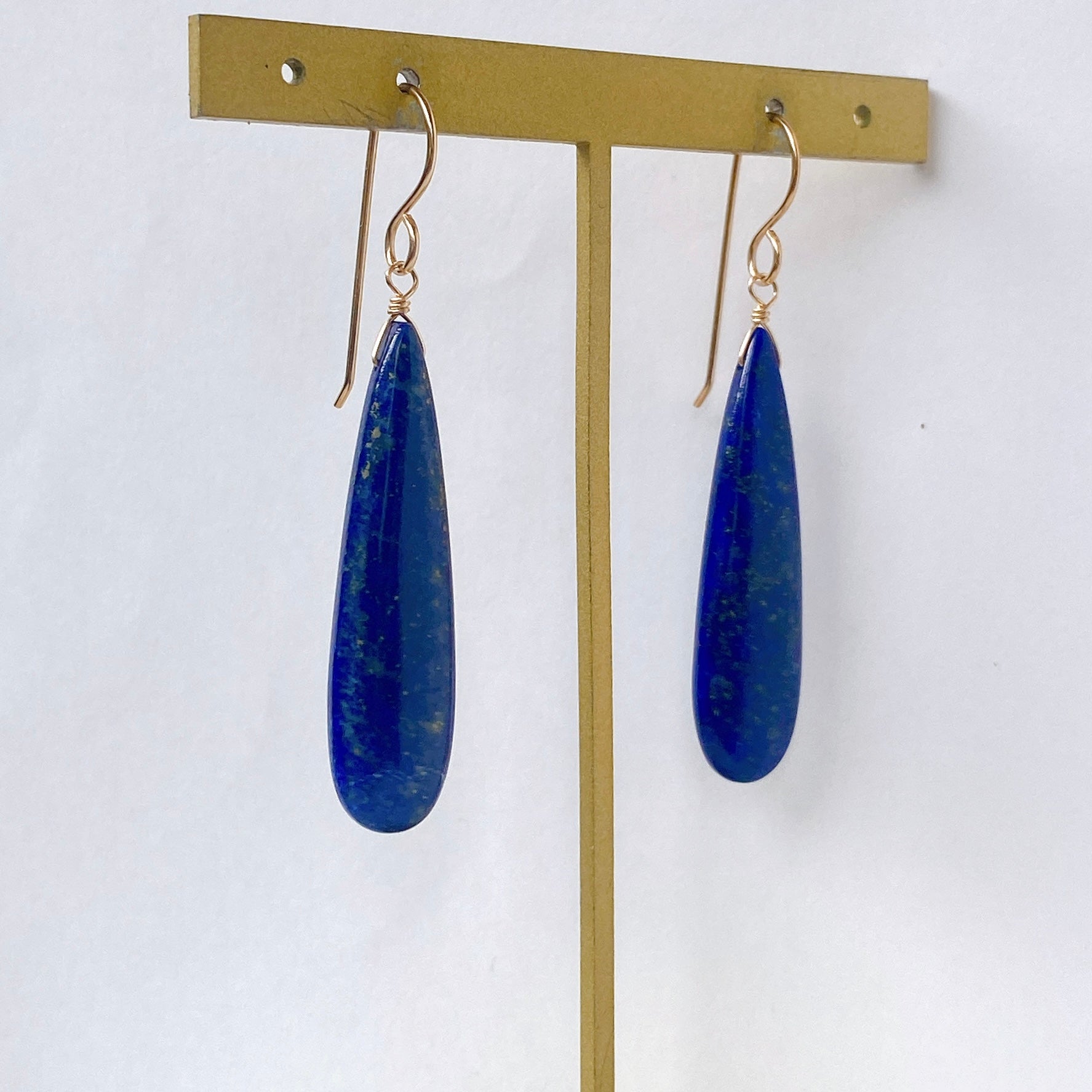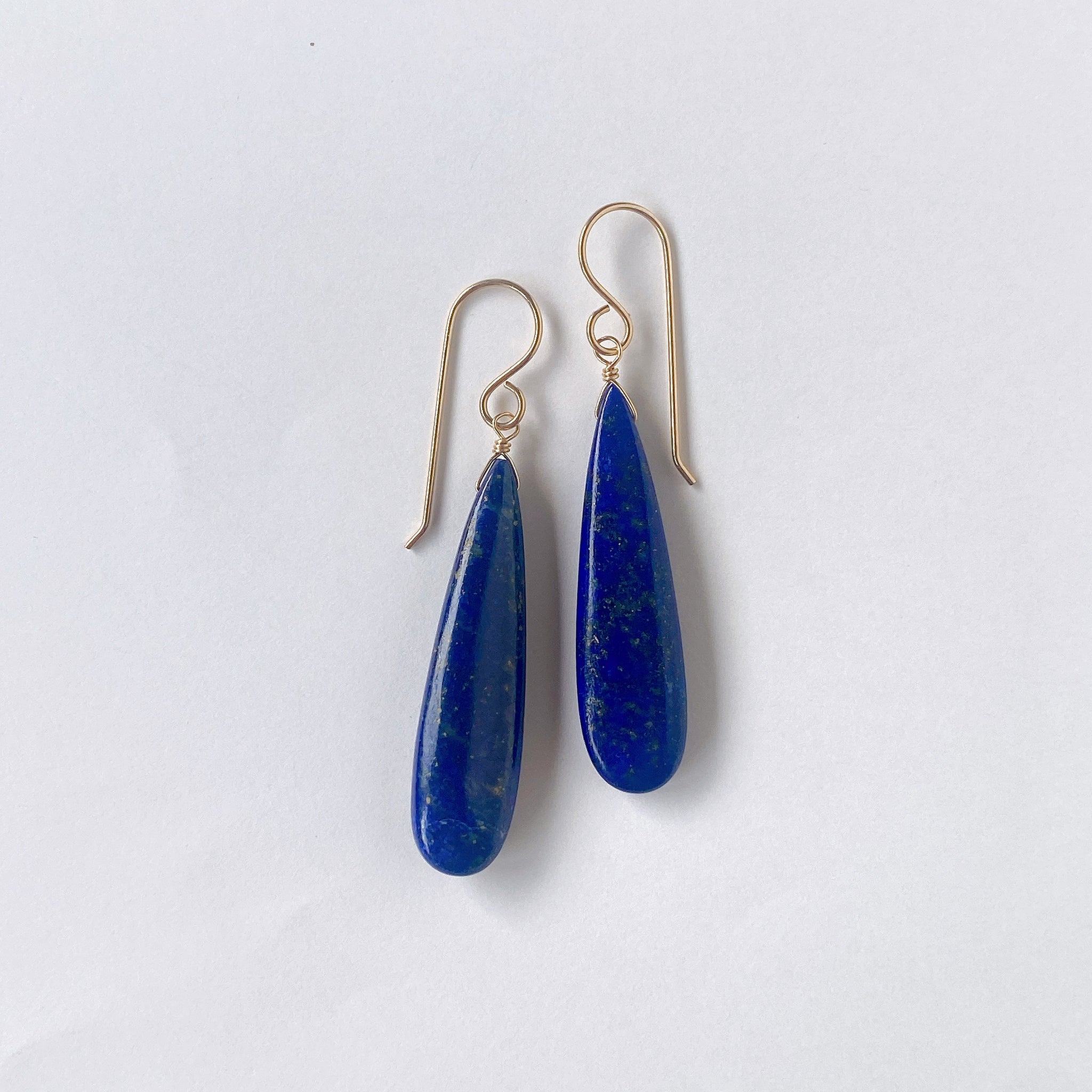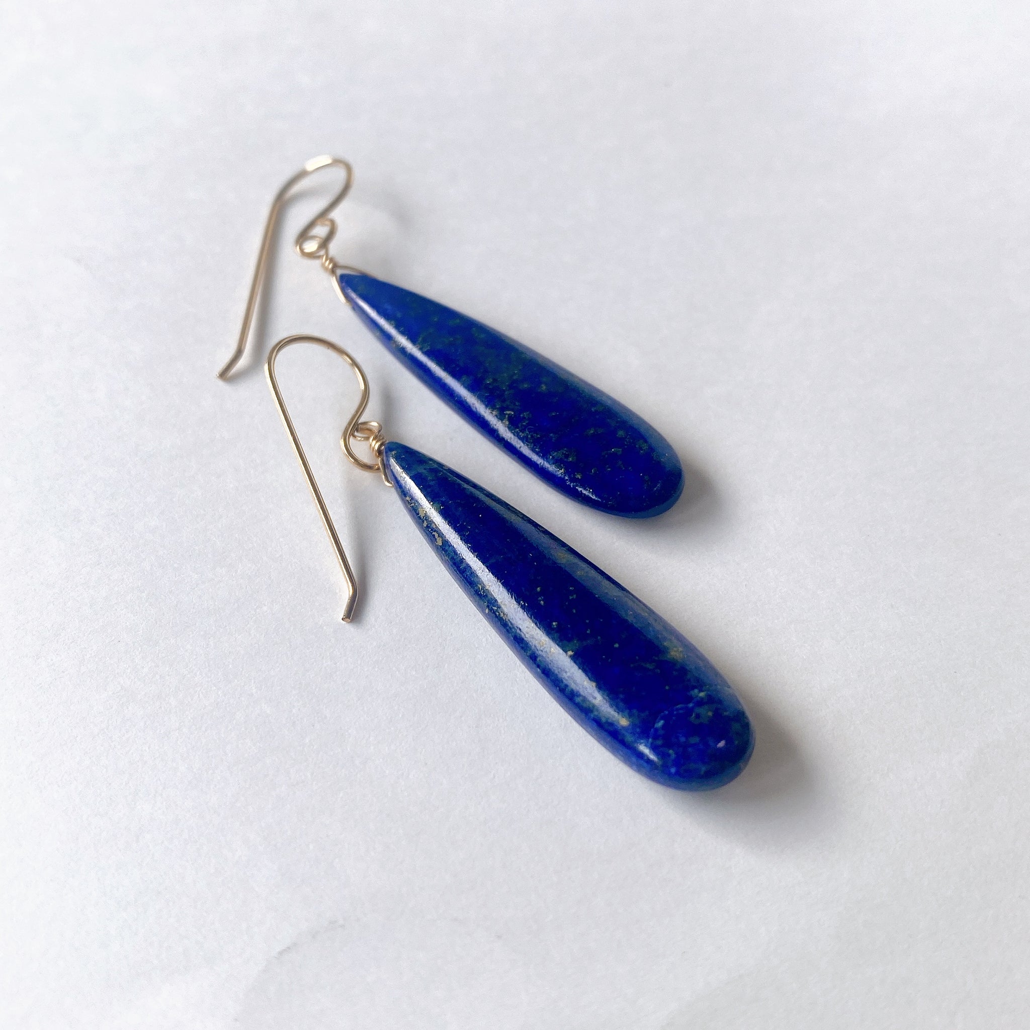ロングペアシェイプカットのラピスラズリを使ってデザインした耳飾りです。