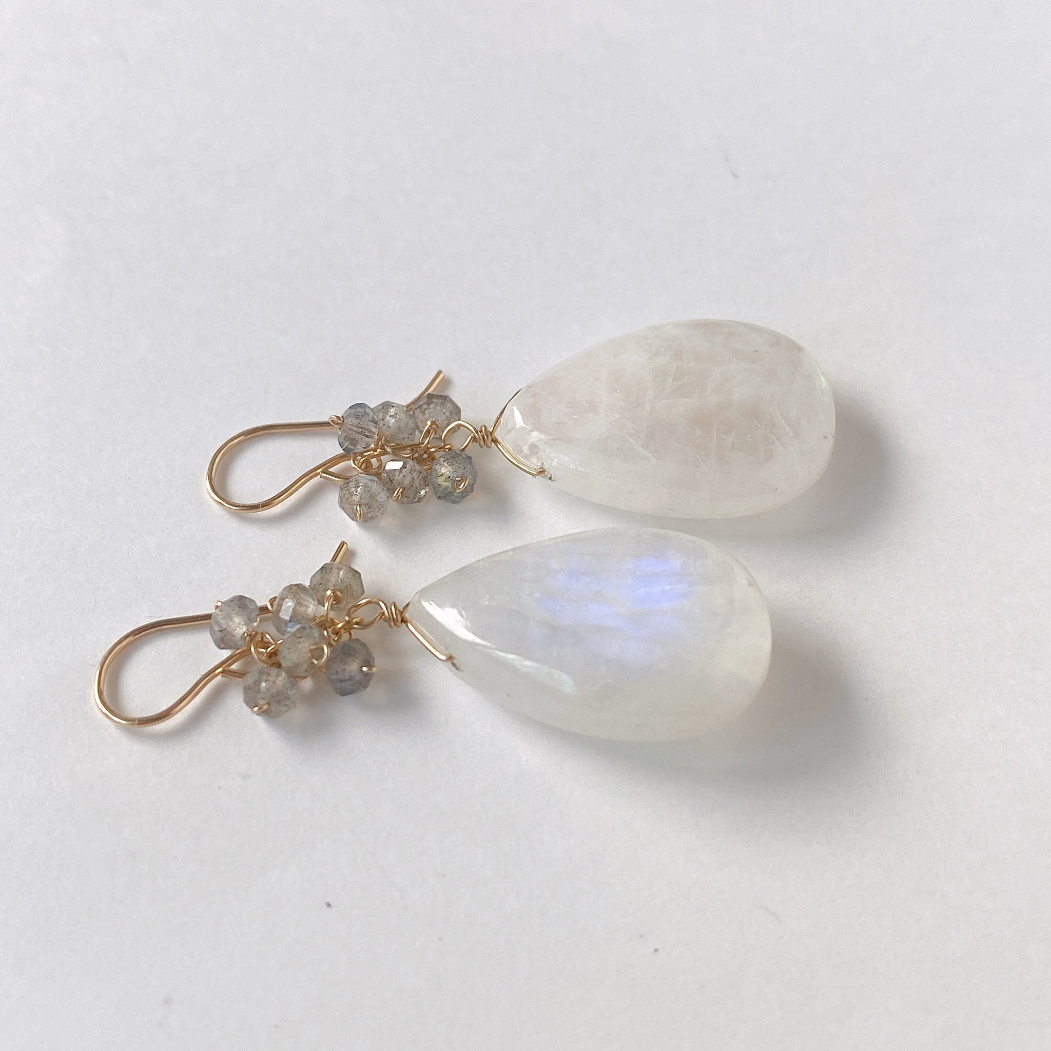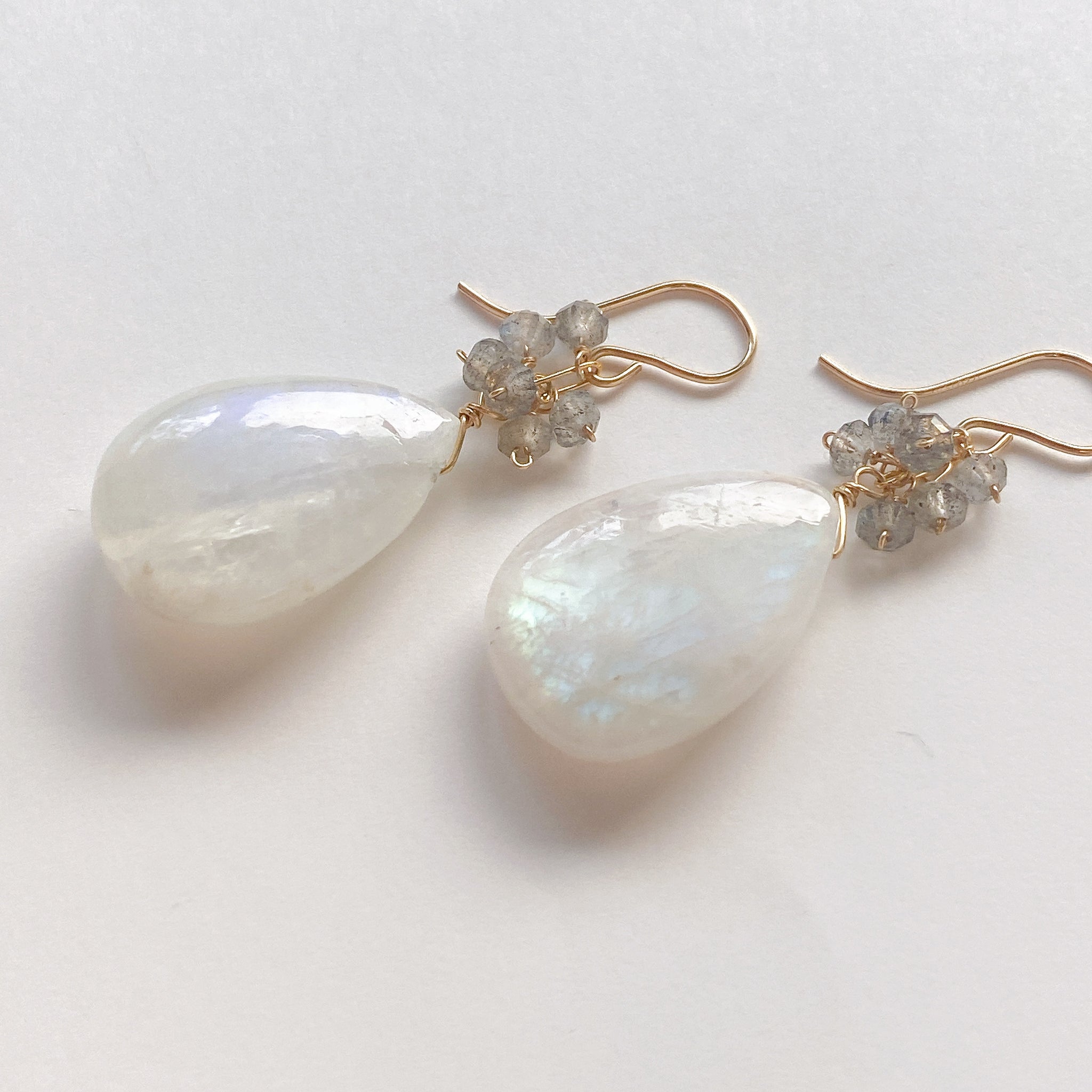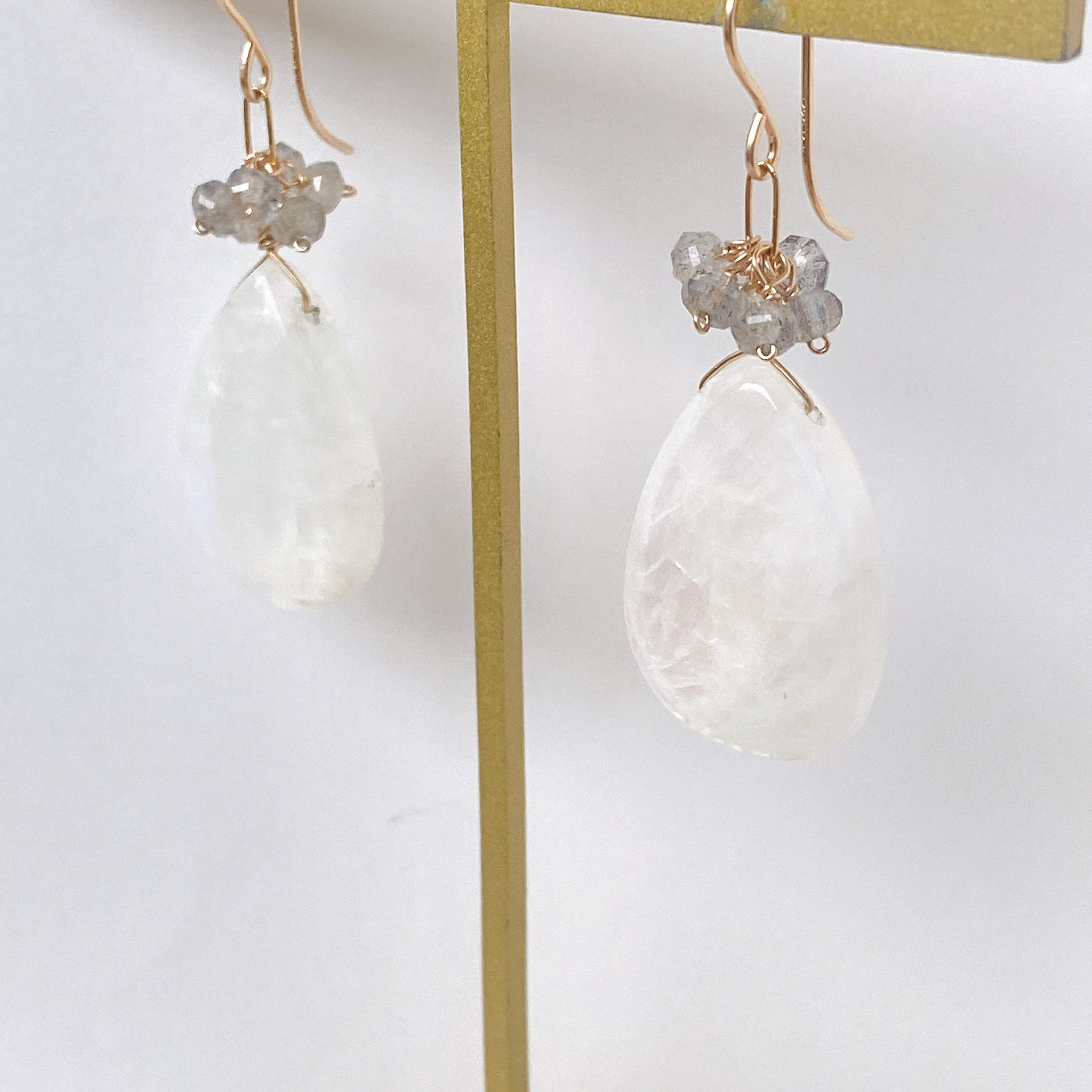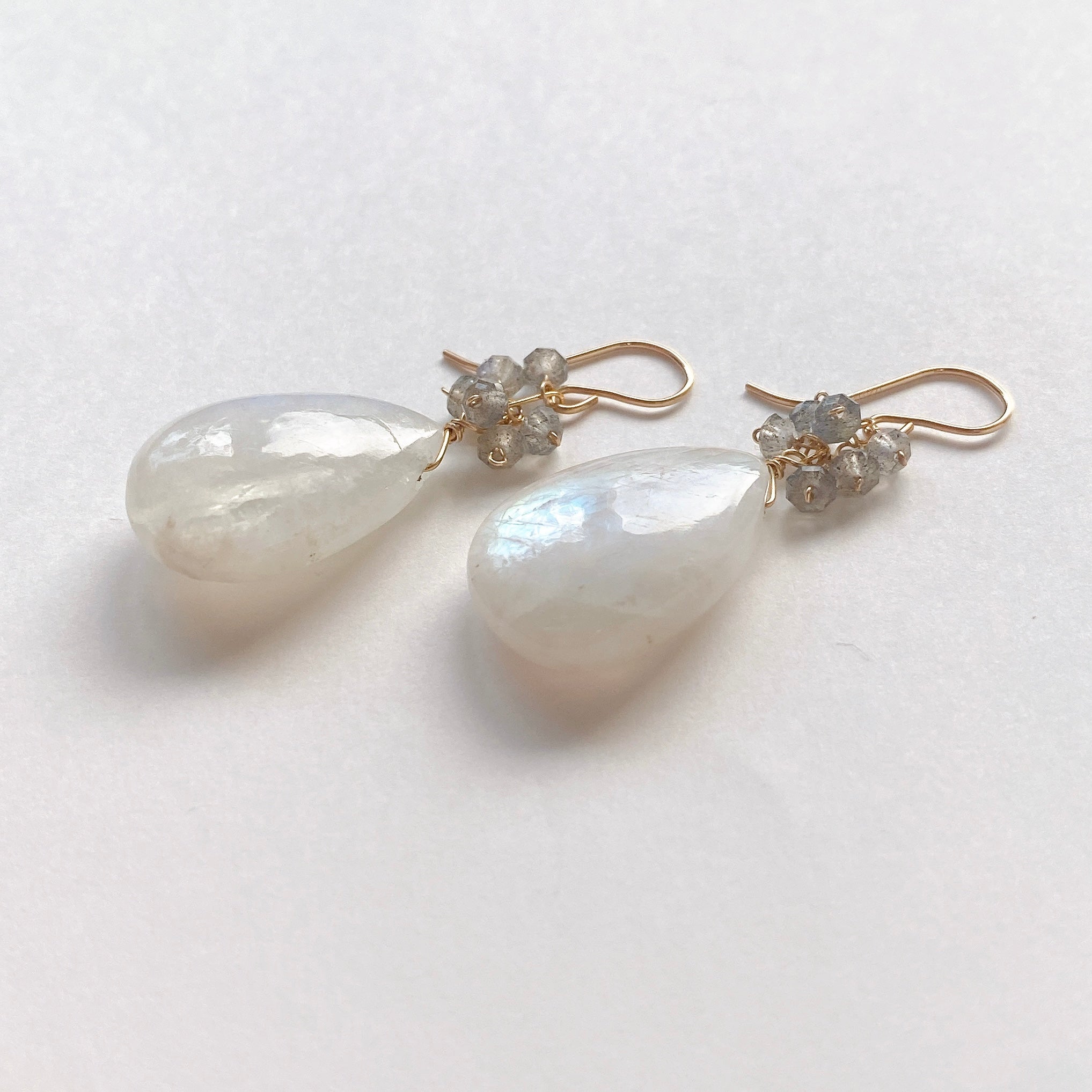ペアシェイプカットのレインボームーンストーンとボタンカットのラブラドライトを使ってデザインした耳飾りです。