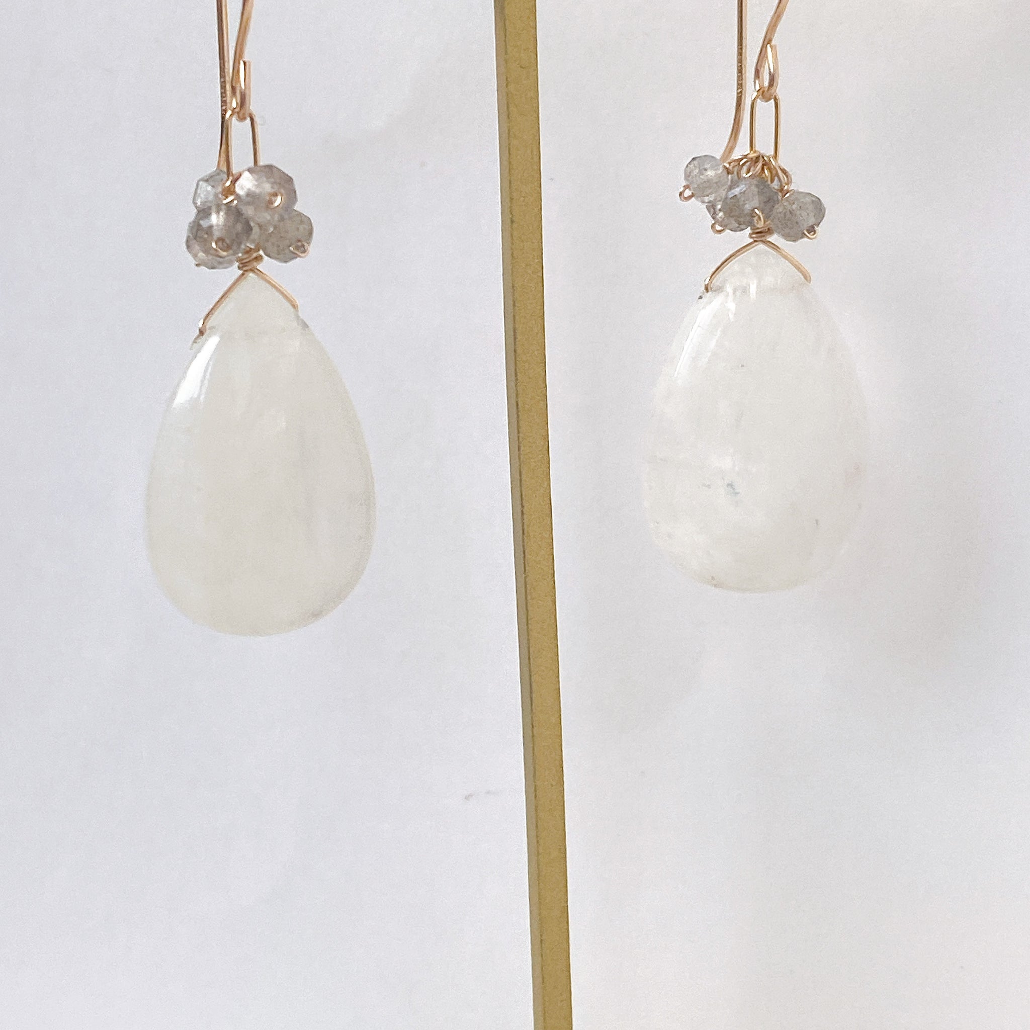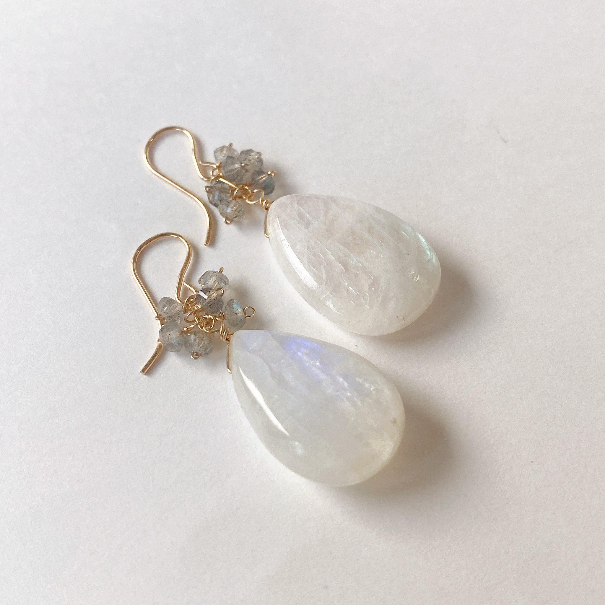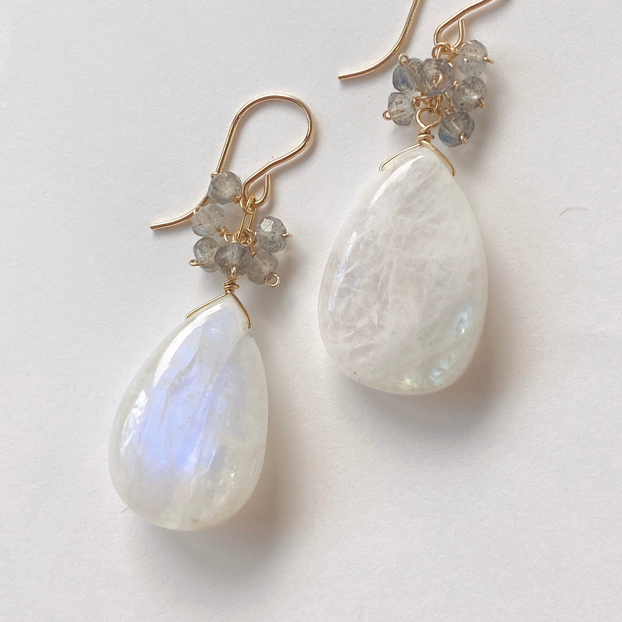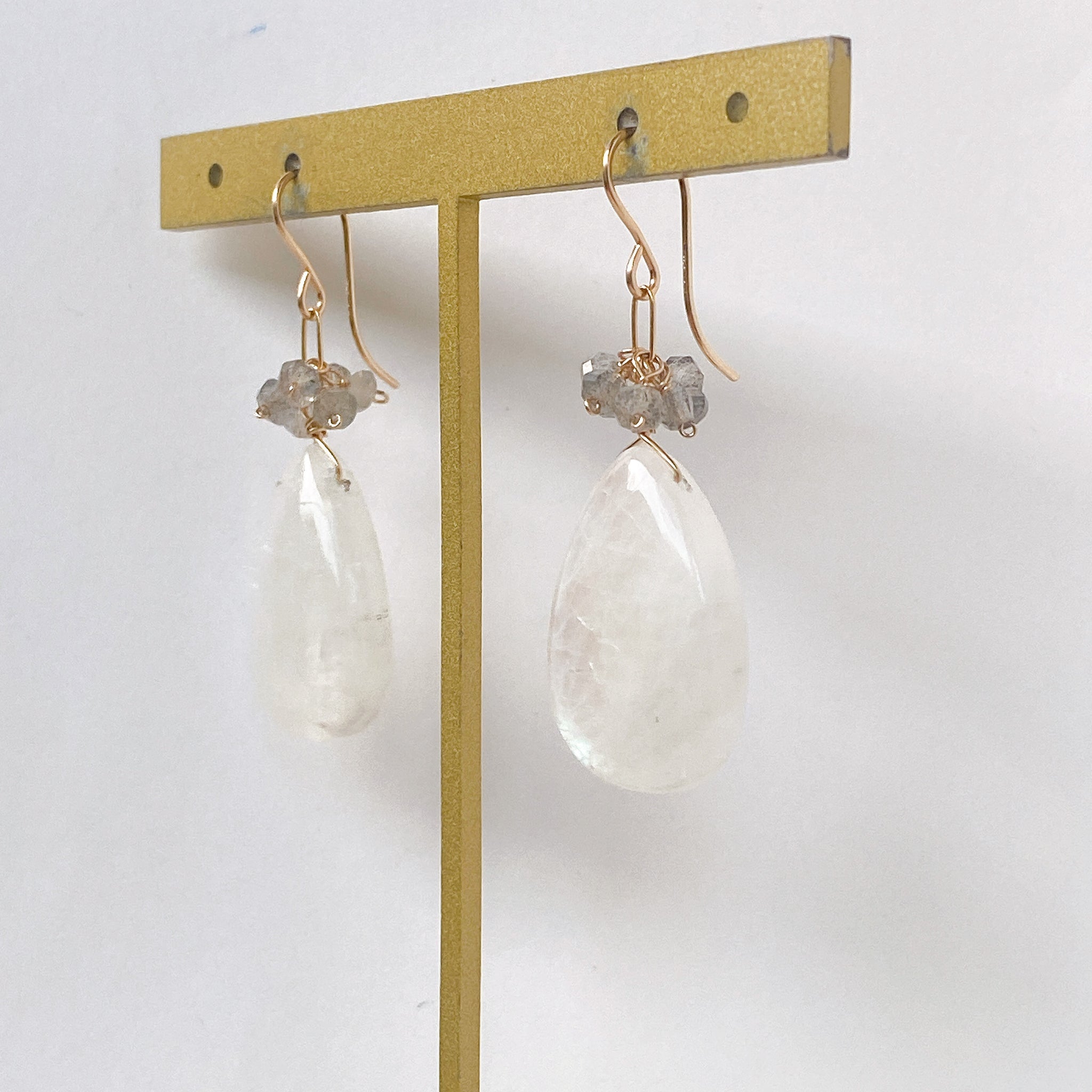 ペアシェイプカットのレインボームーンストーンとボタンカットのラブラドライトを使ってデザインした耳飾りです。