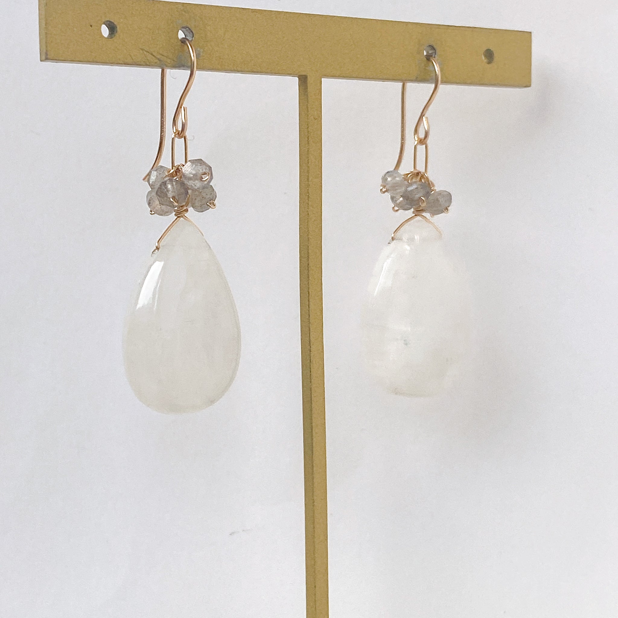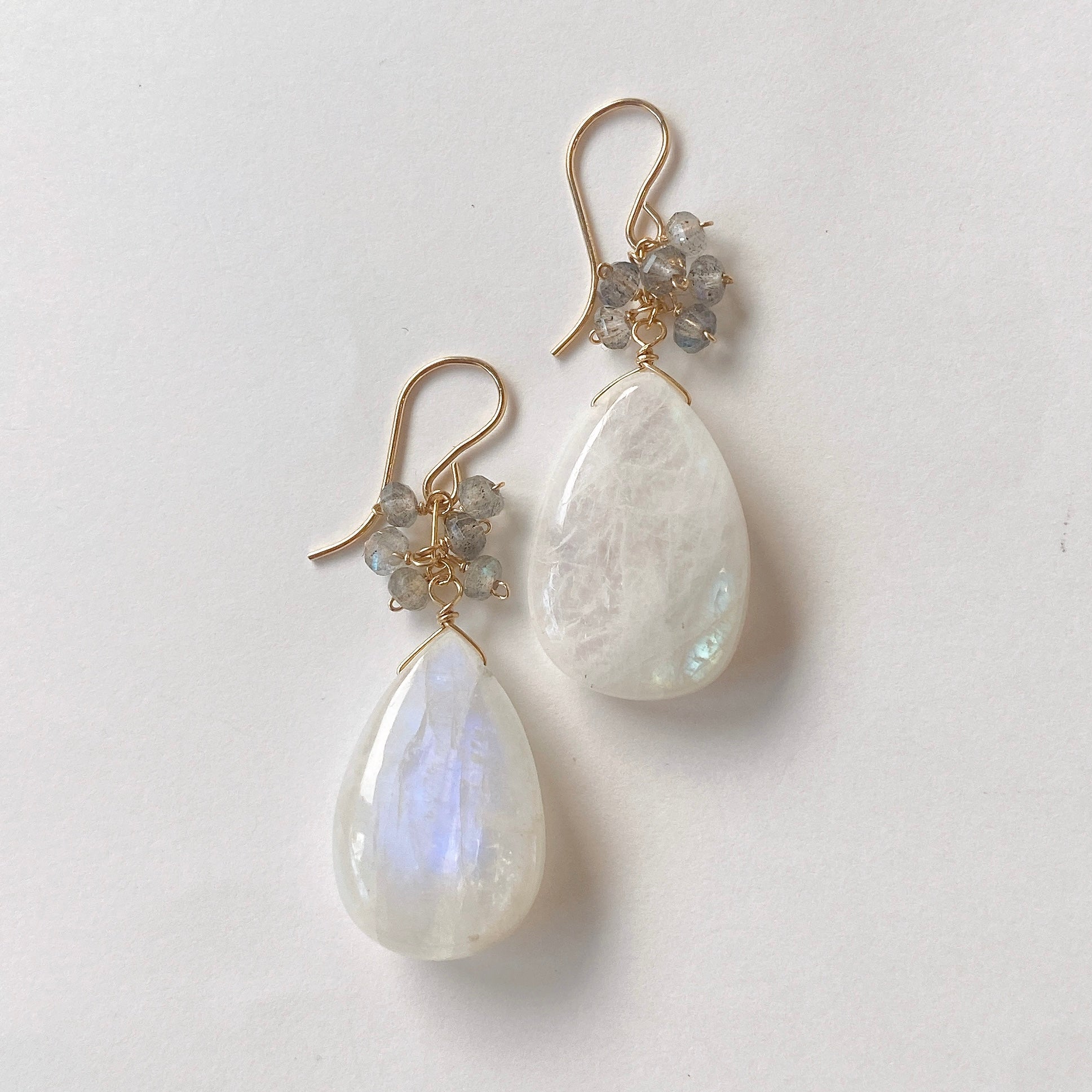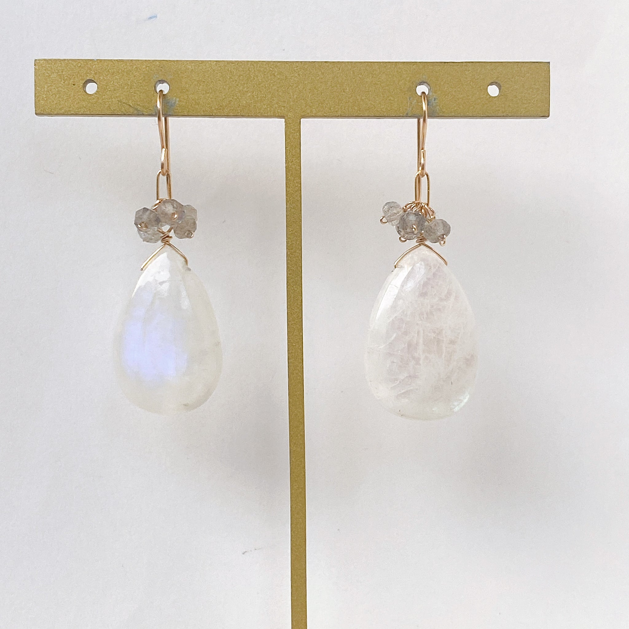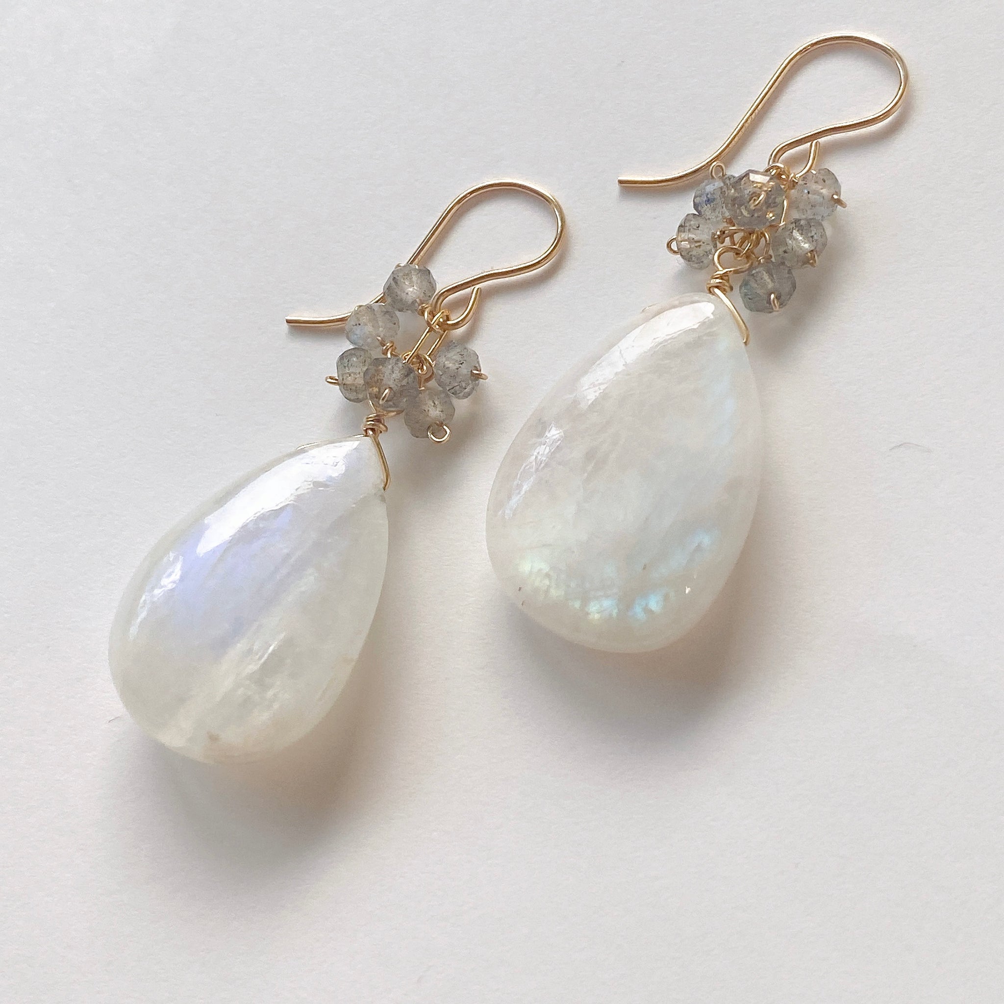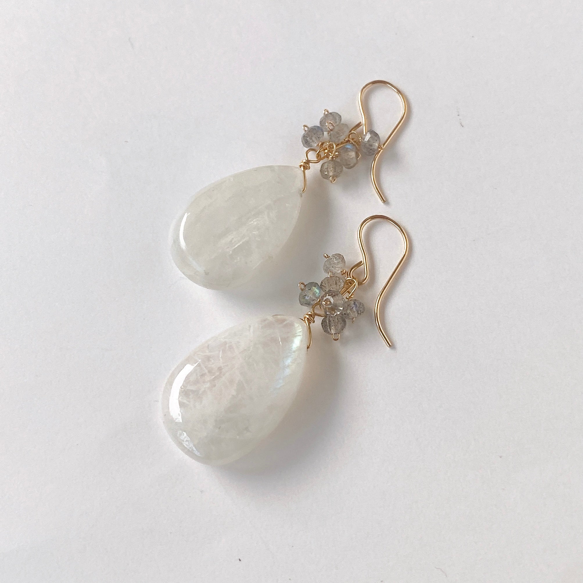 ペアシェイプカットのレインボームーンストーンとボタンカットのラブラドライトを使ってデザインした耳飾りです。
