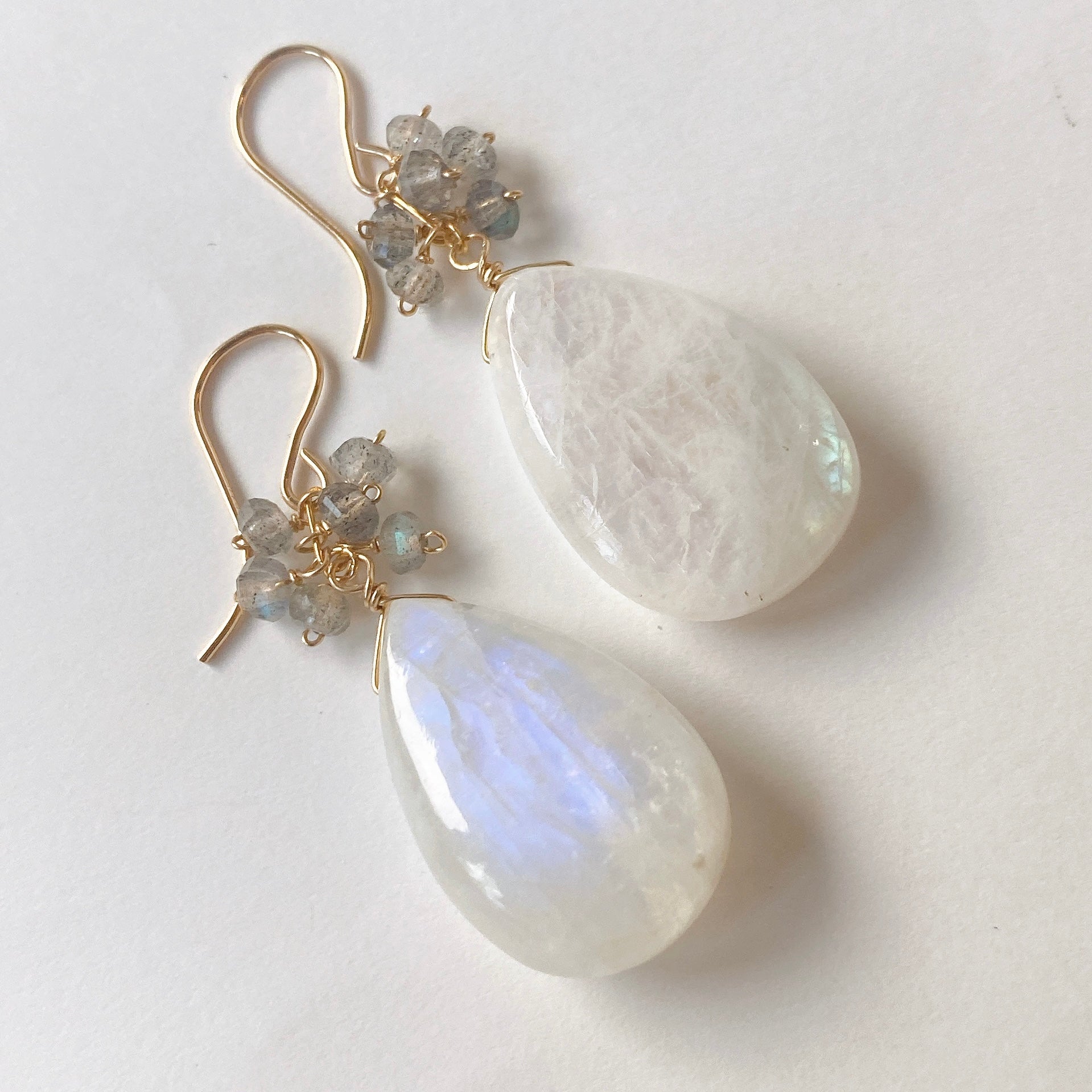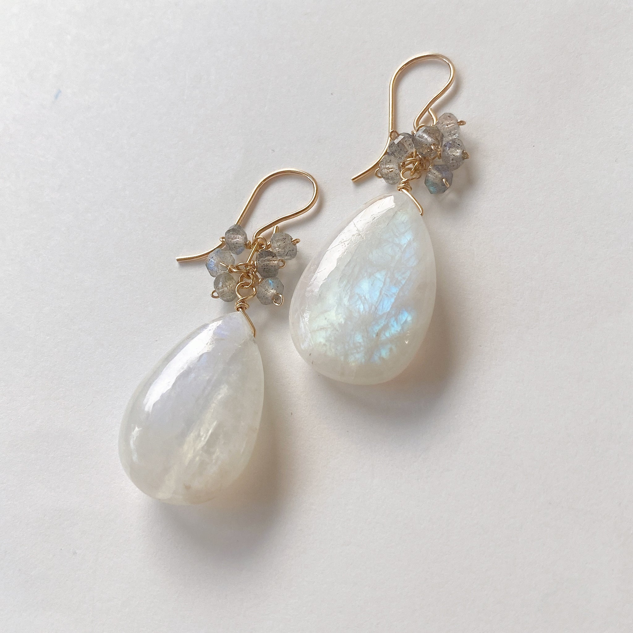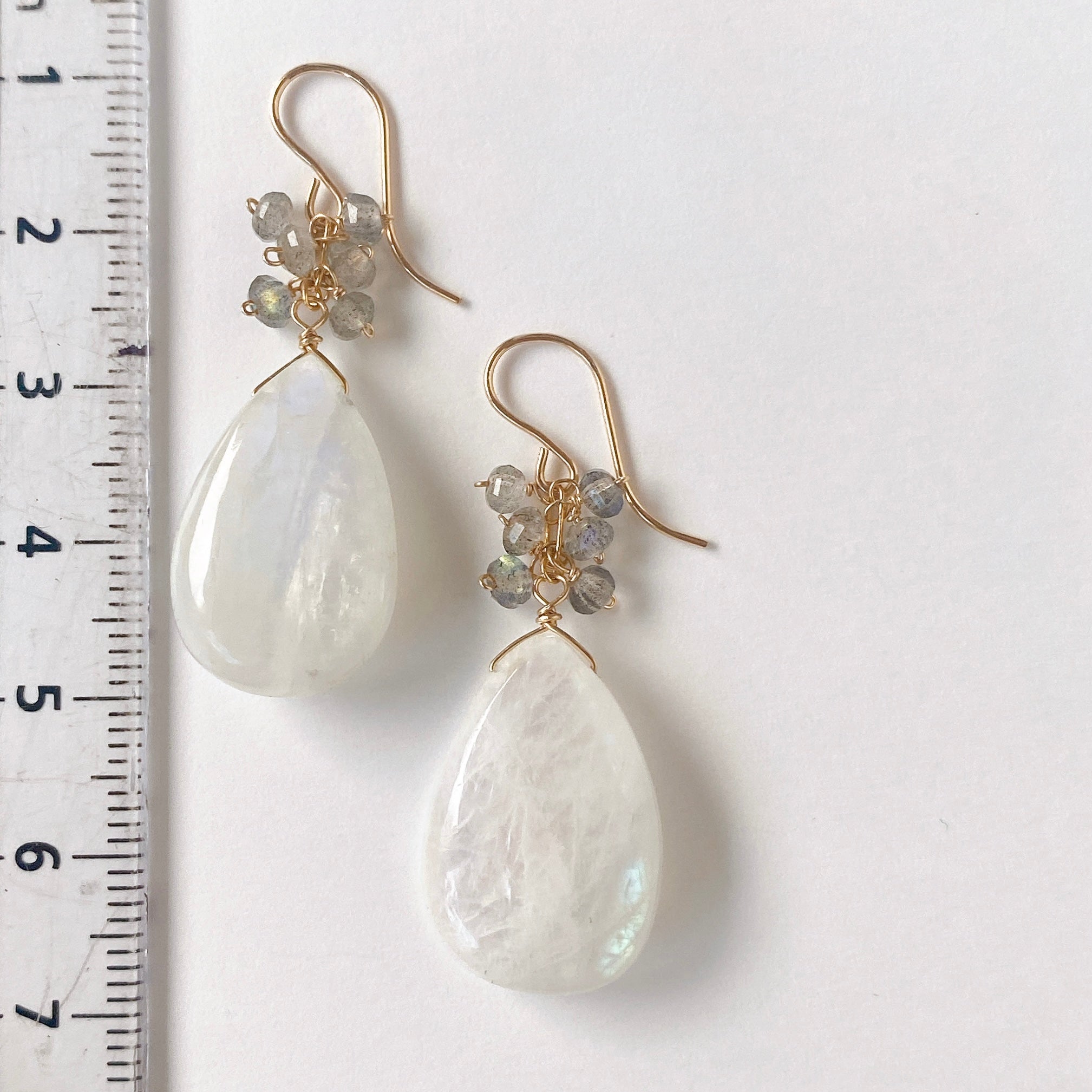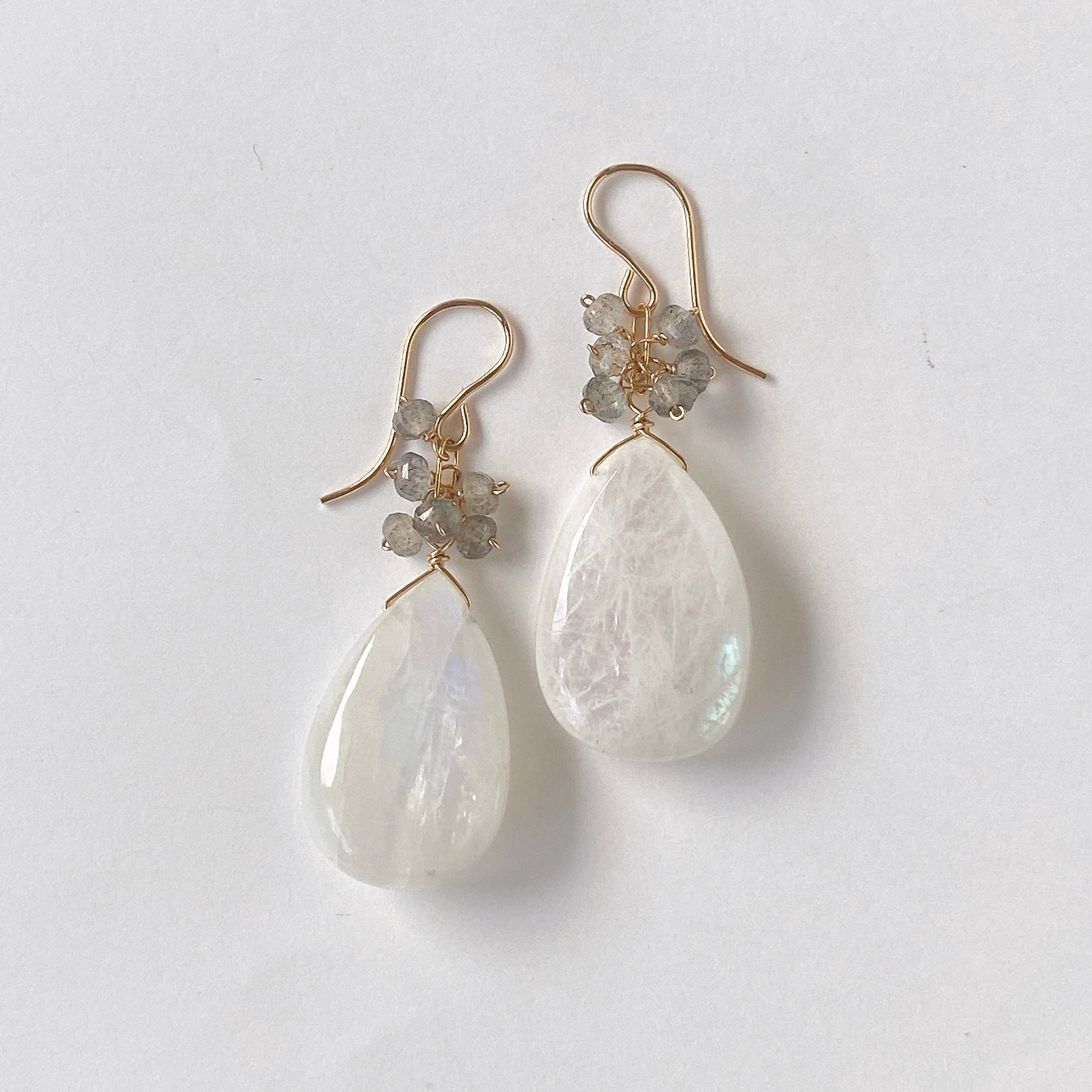 ペアシェイプカットのレインボームーンストーンとボタンカットのラブラドライトを使ってデザインした耳飾りです。