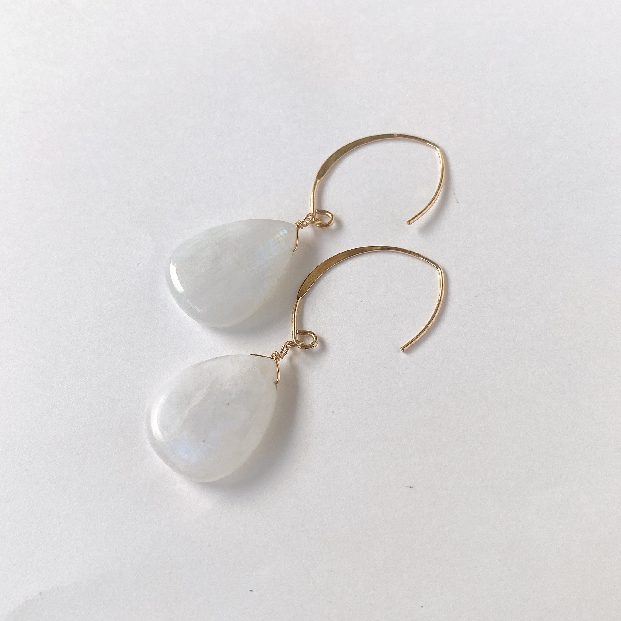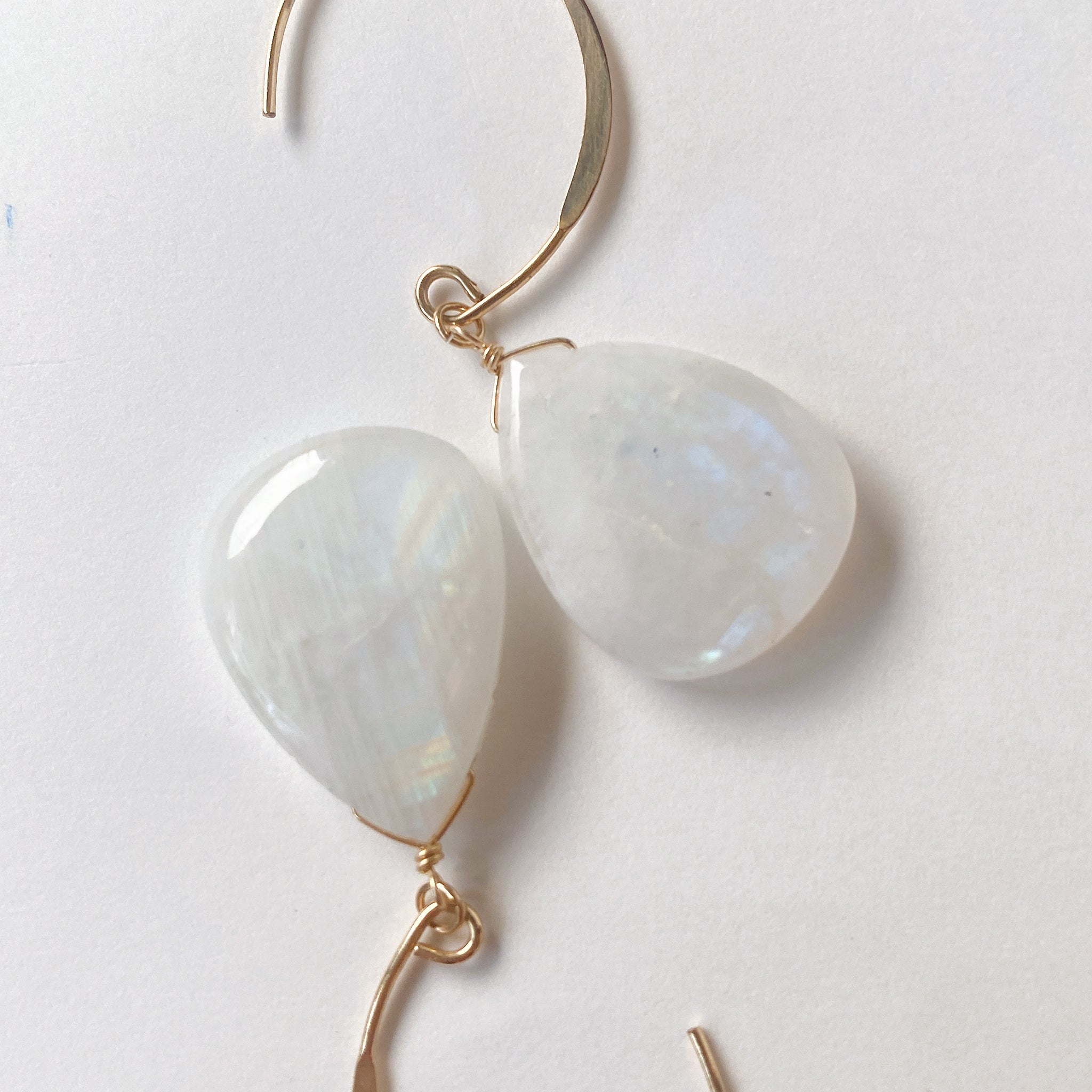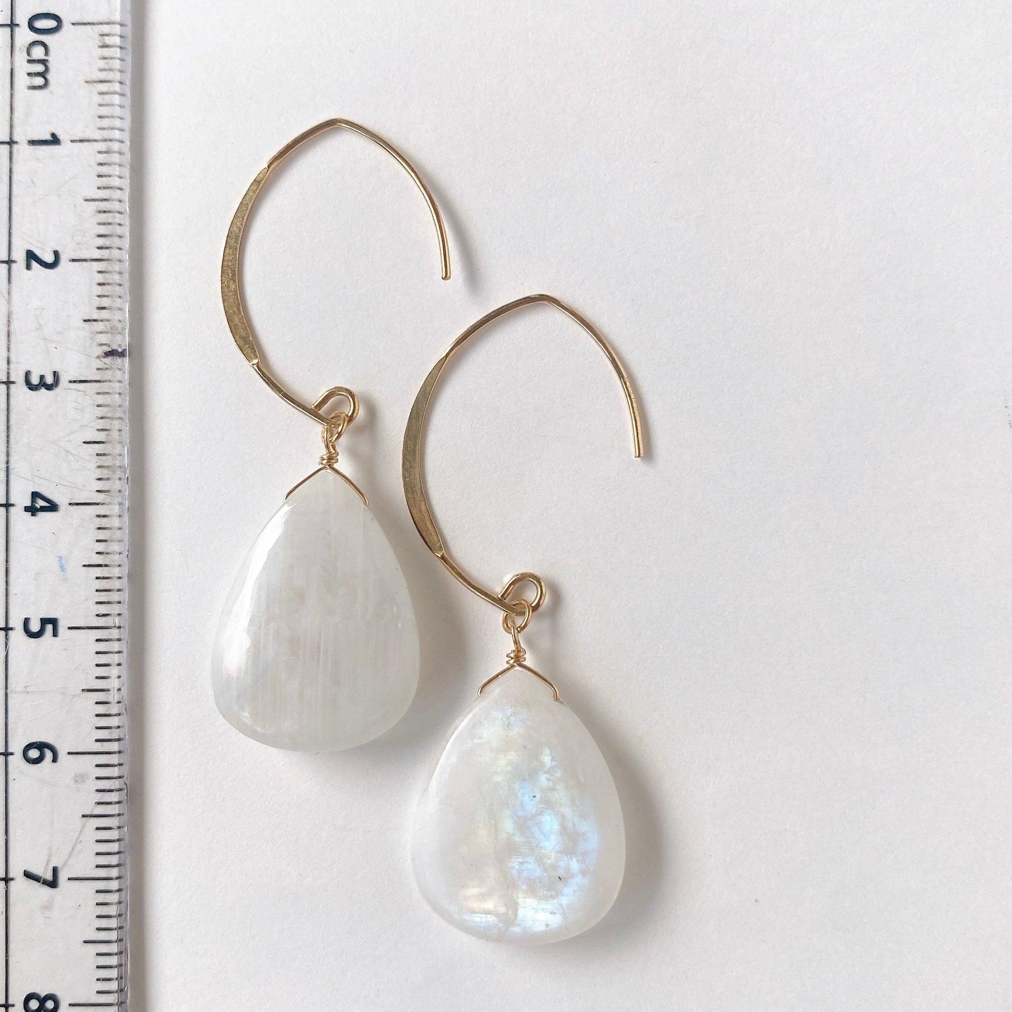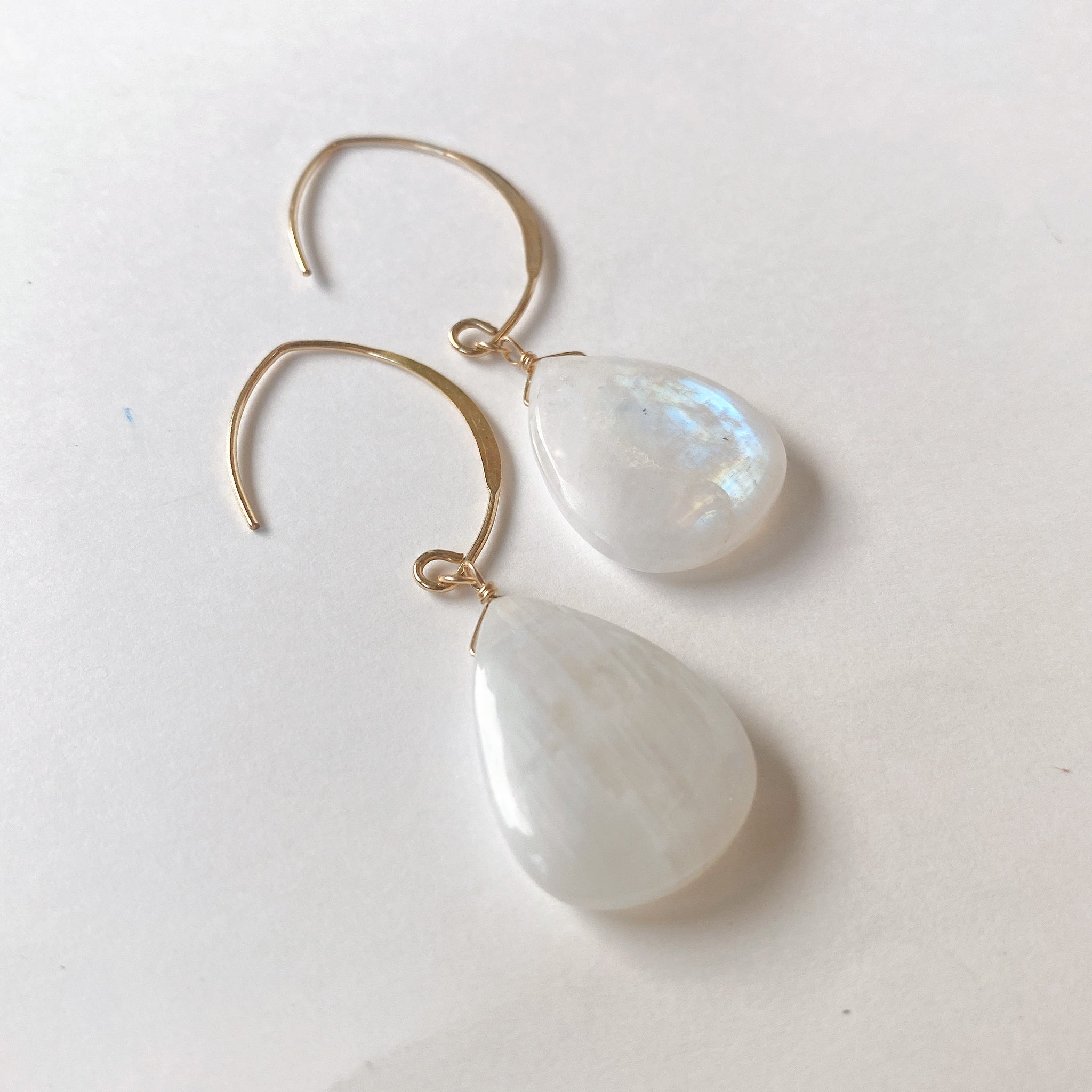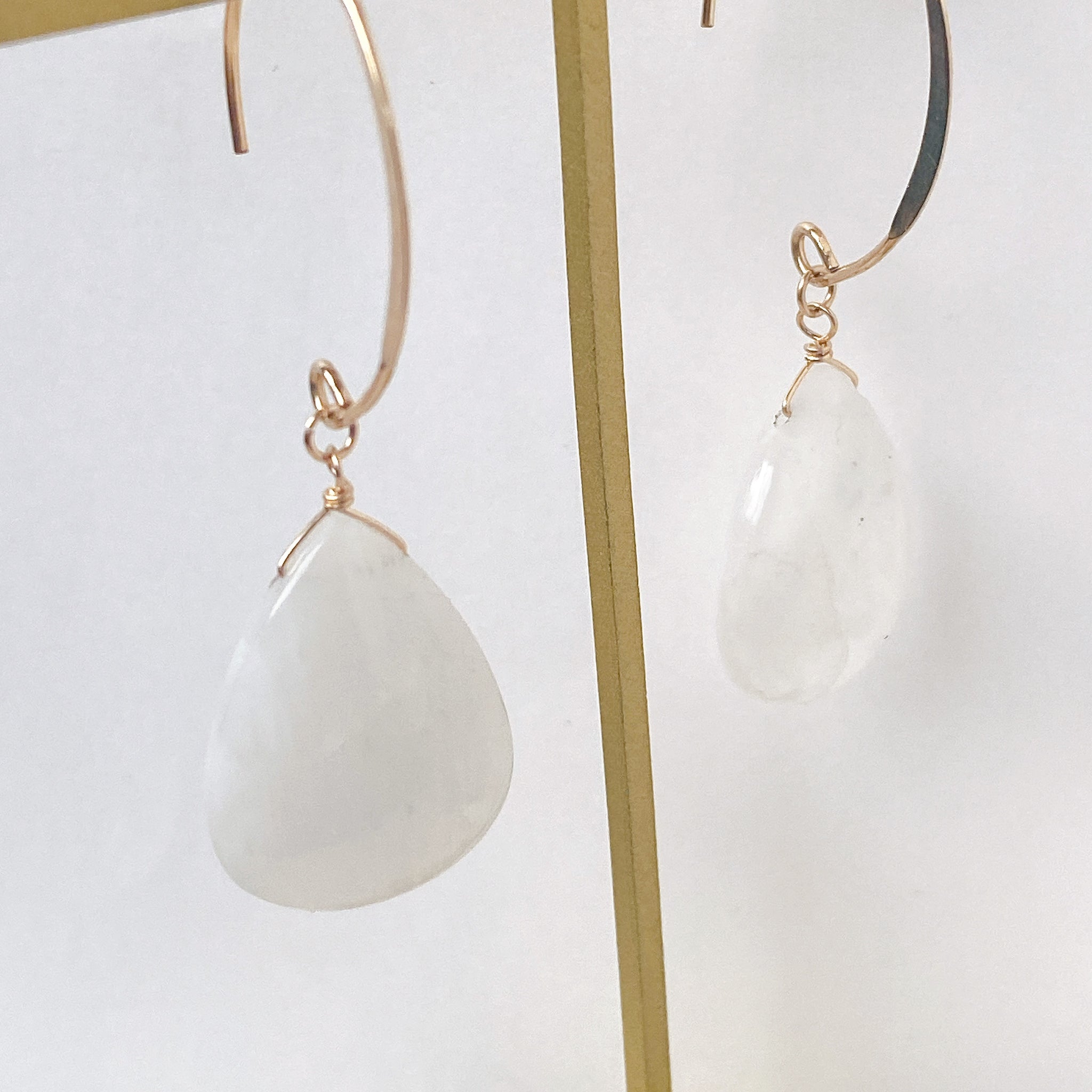 ペアシェイプカットのレインボームーンストーンを使ってデザインした耳飾りです。