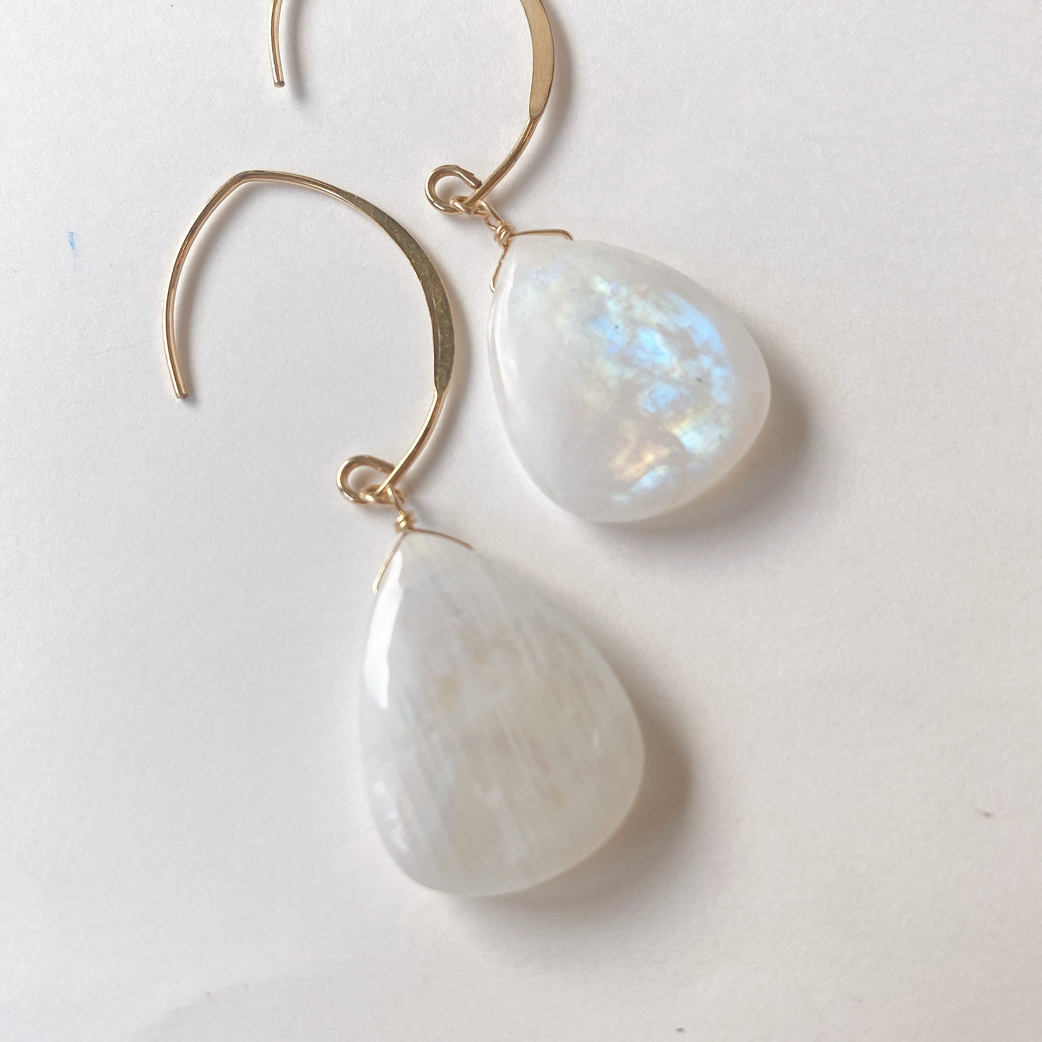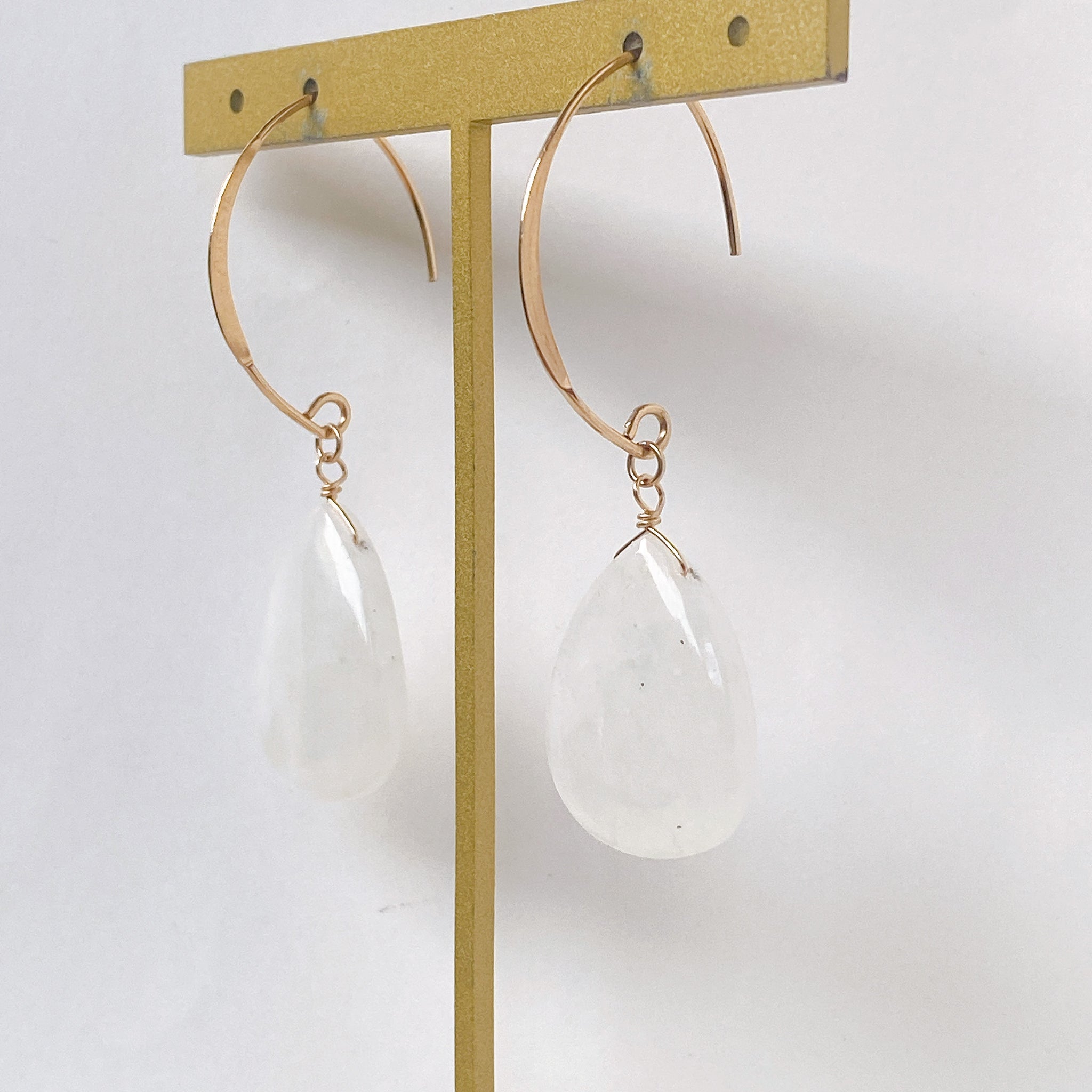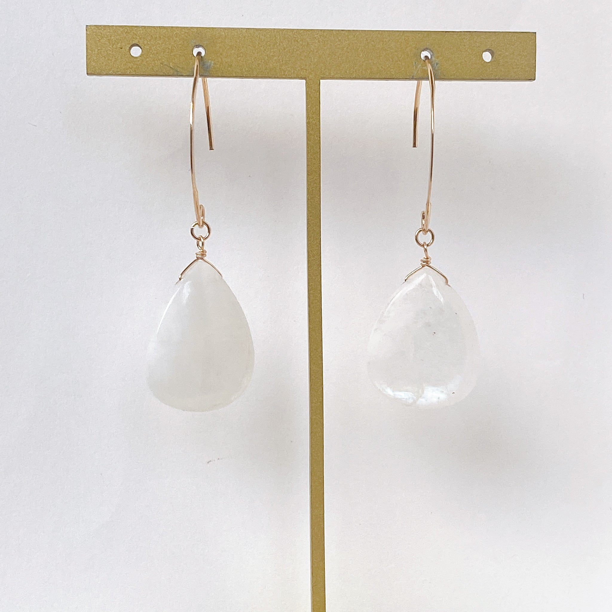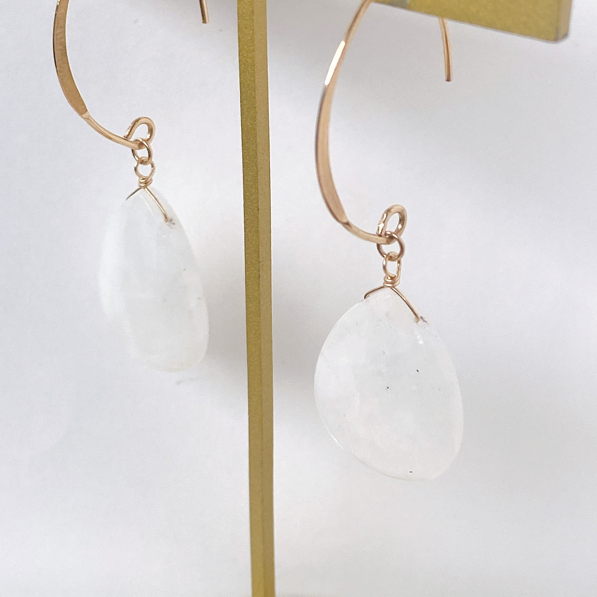 ペアシェイプカットのレインボームーンストーンを使ってデザインした耳飾りです。