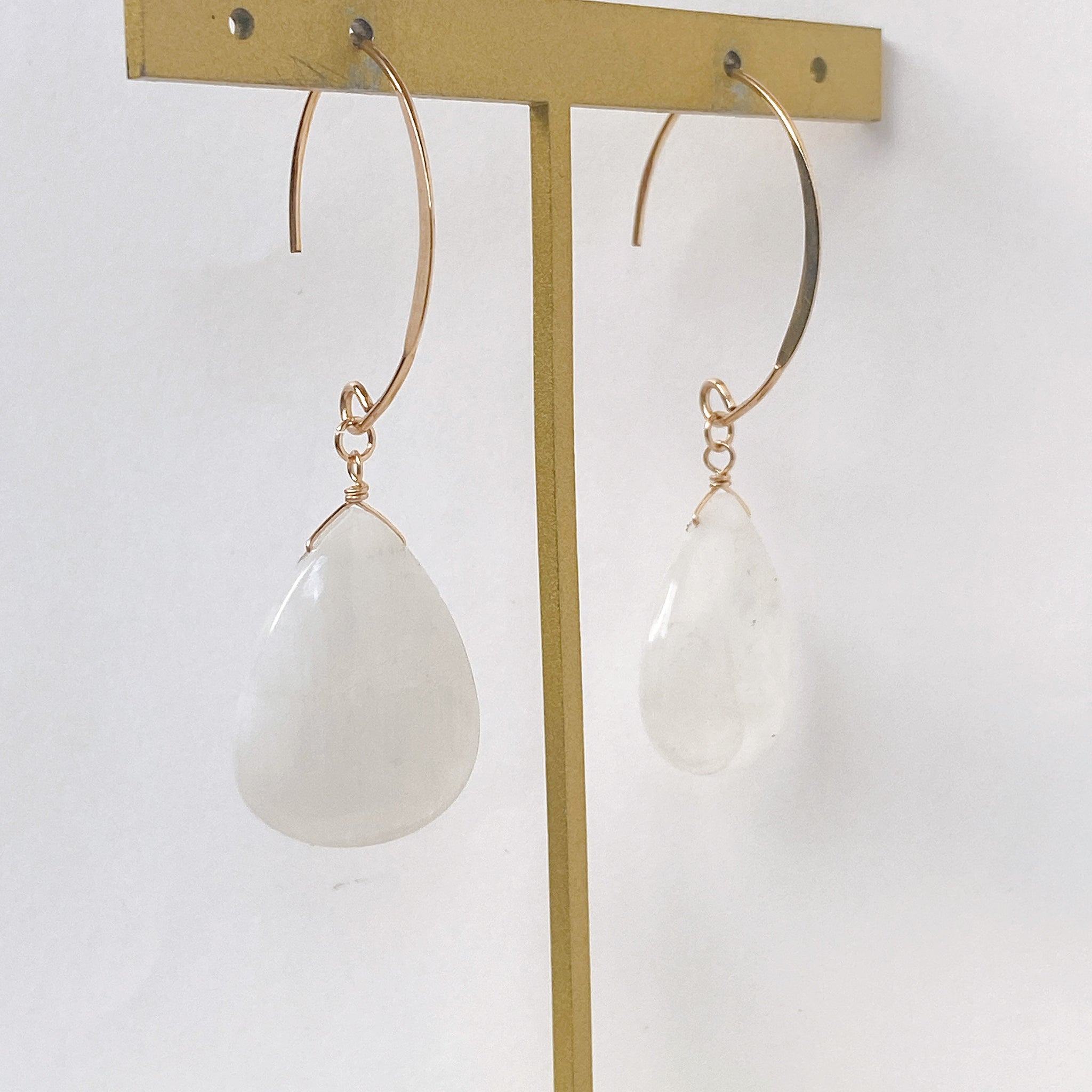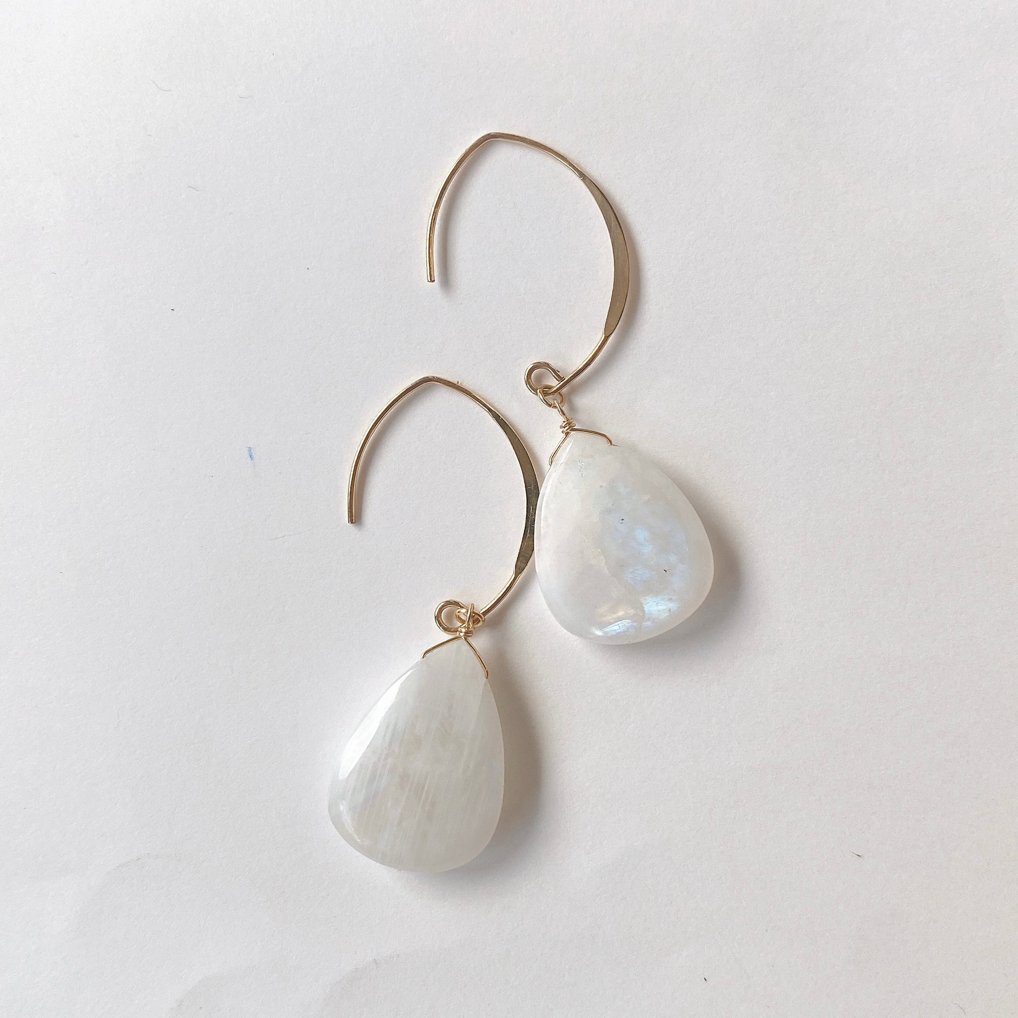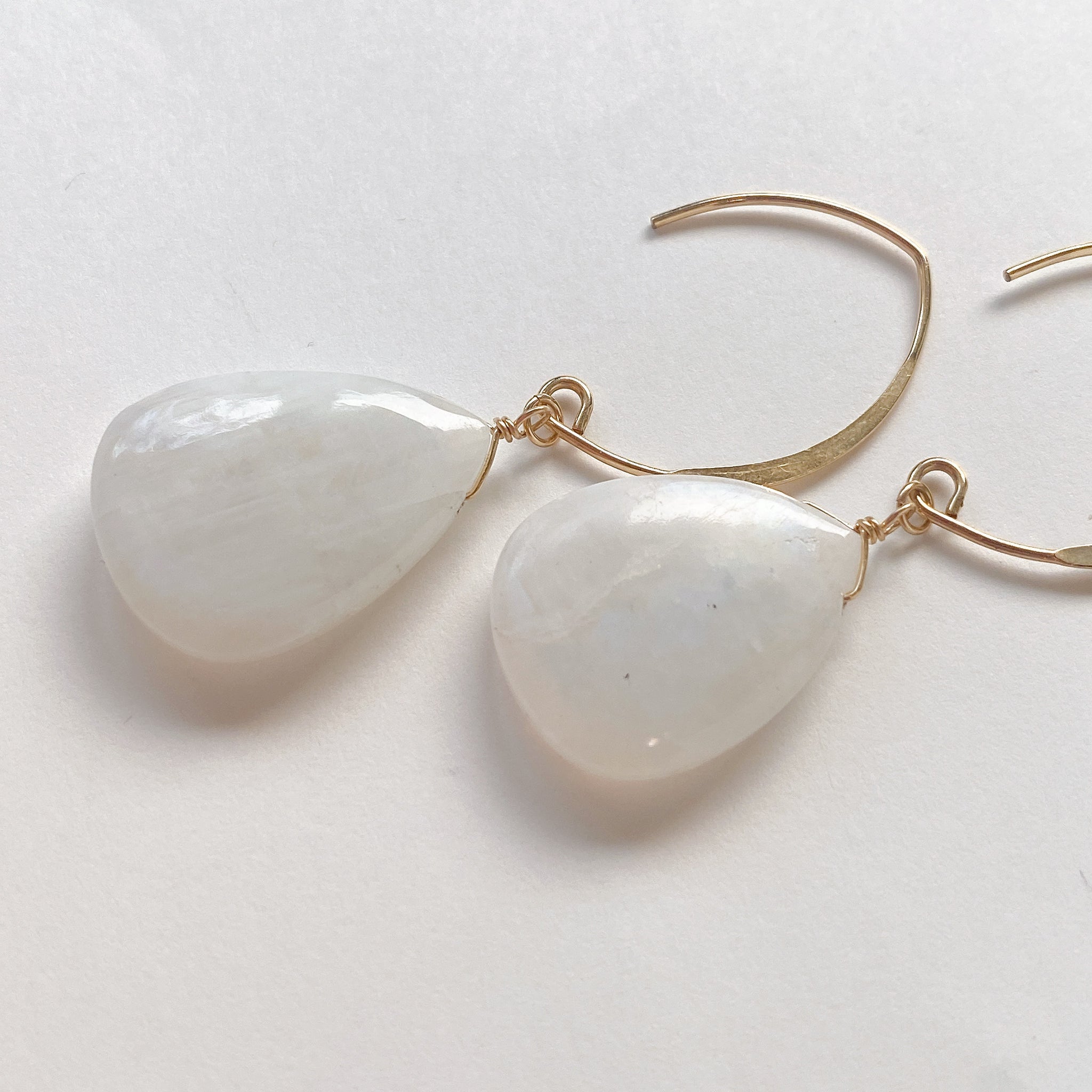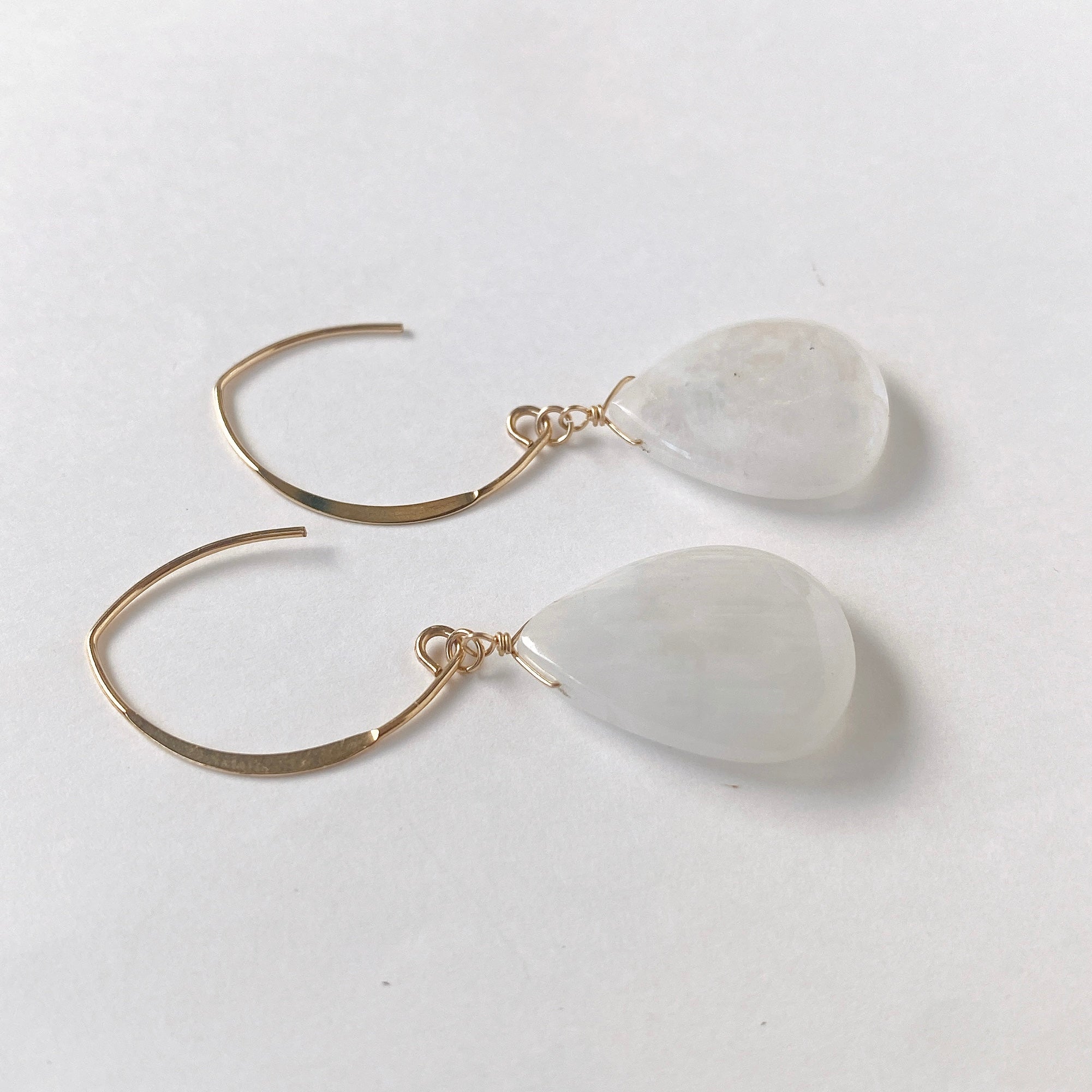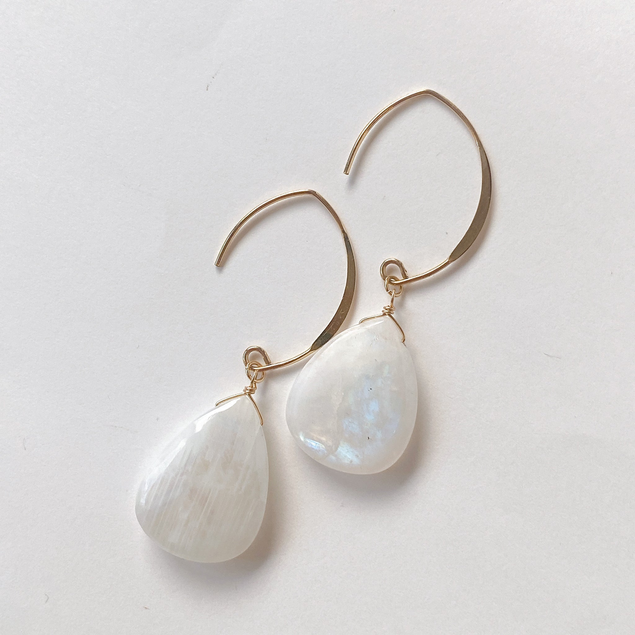 ペアシェイプカットのレインボームーンストーンを使ってデザインした耳飾りです。