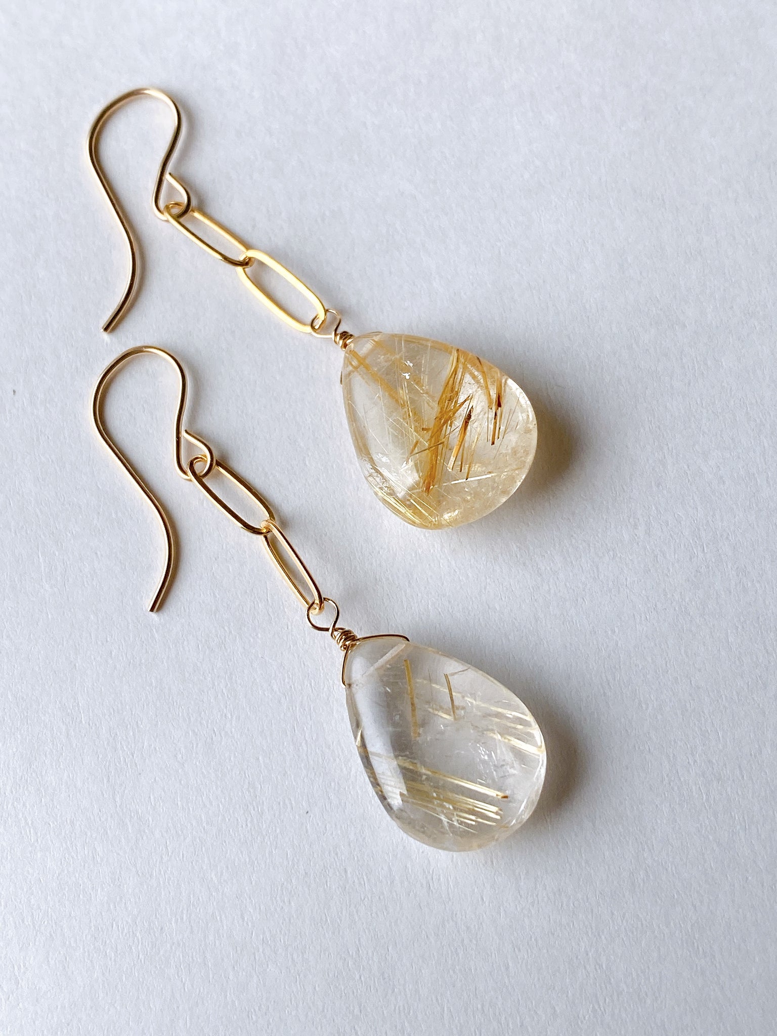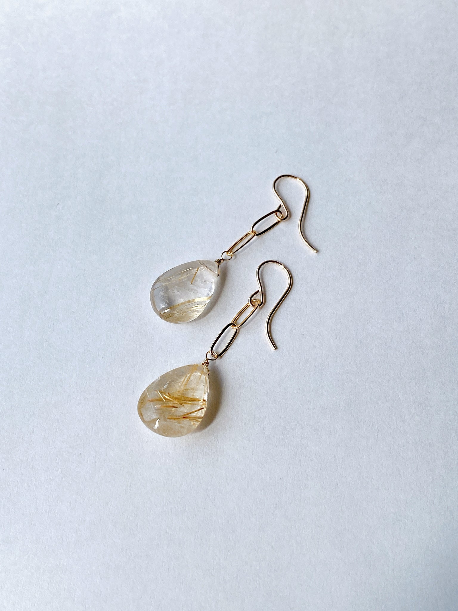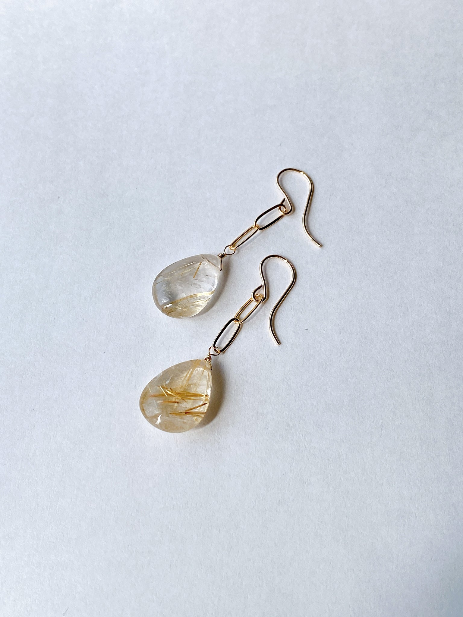 つるんとしたペアシェイプカットのゴールデンルチルクォーツを使ってデザインしたシンプルな耳飾りです。
