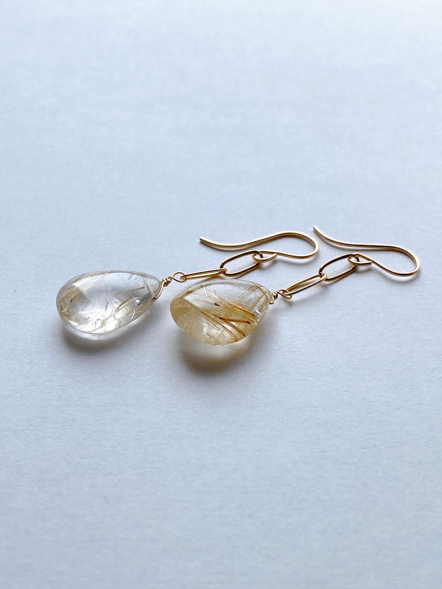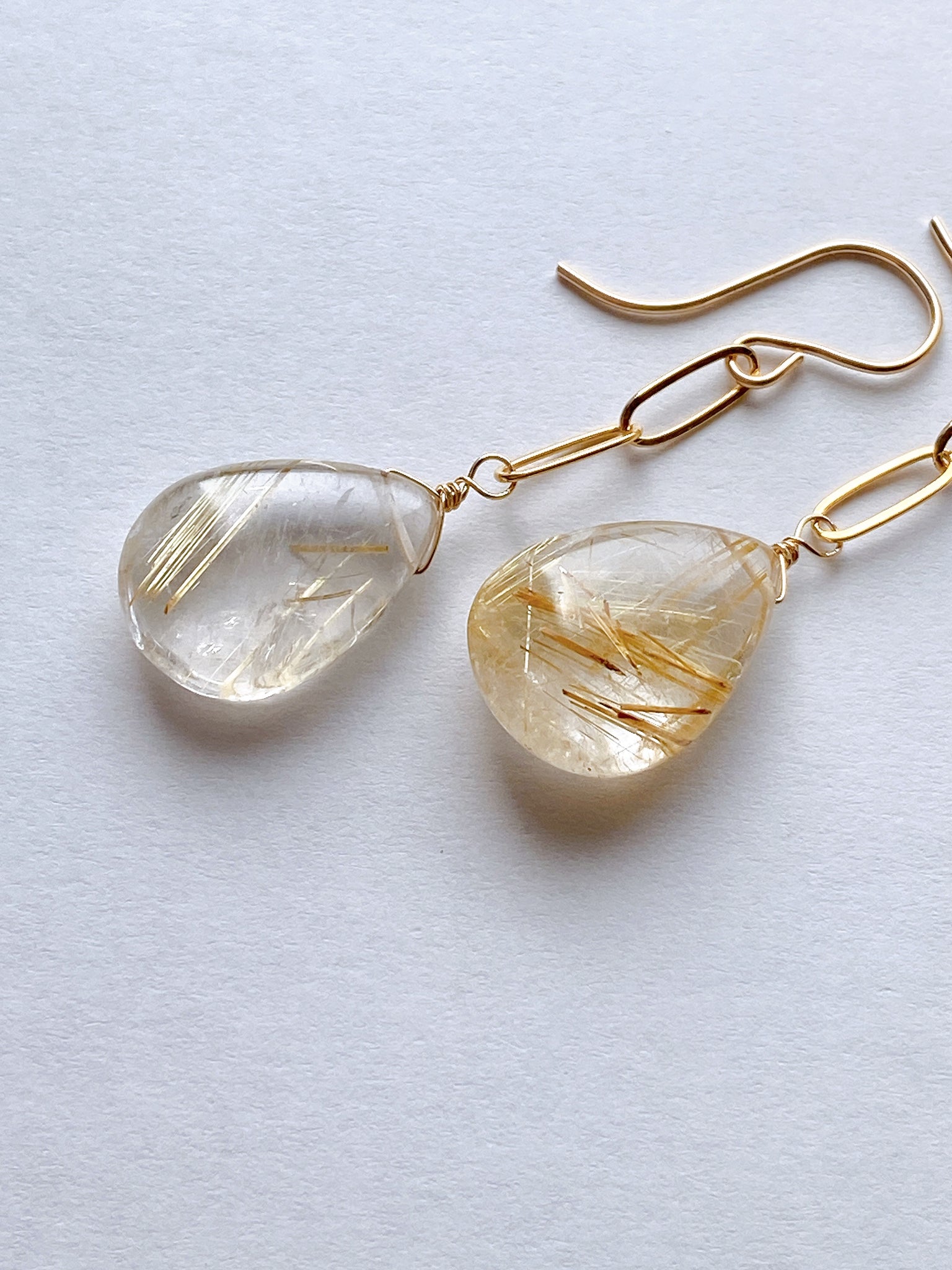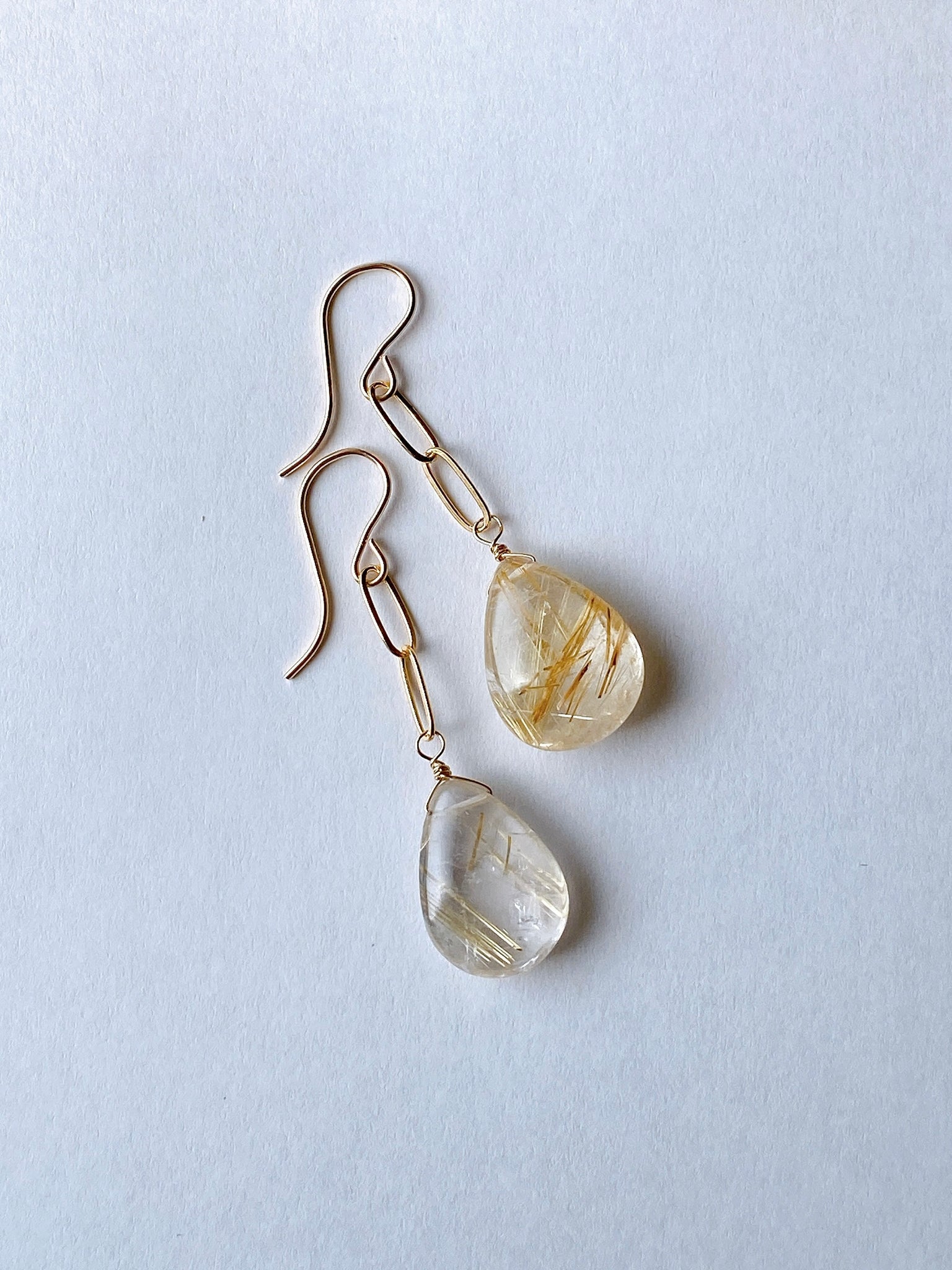 つるんとしたペアシェイプカットのゴールデンルチルクォーツを使ってデザインしたシンプルな耳飾りです。