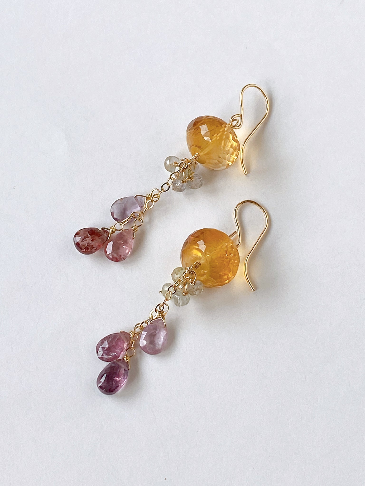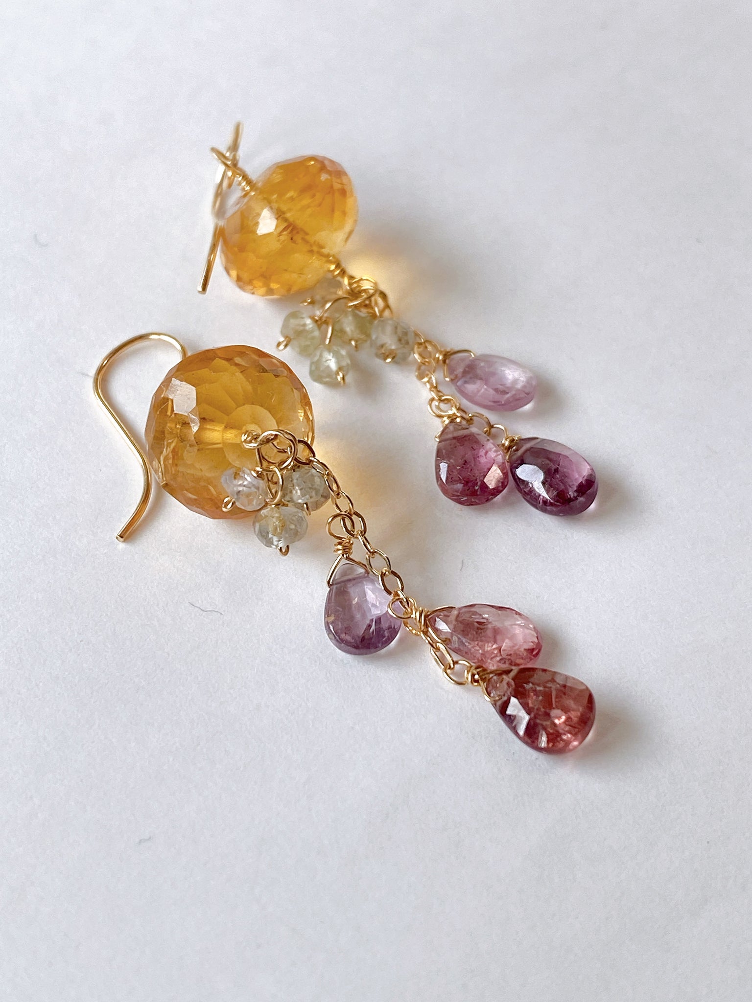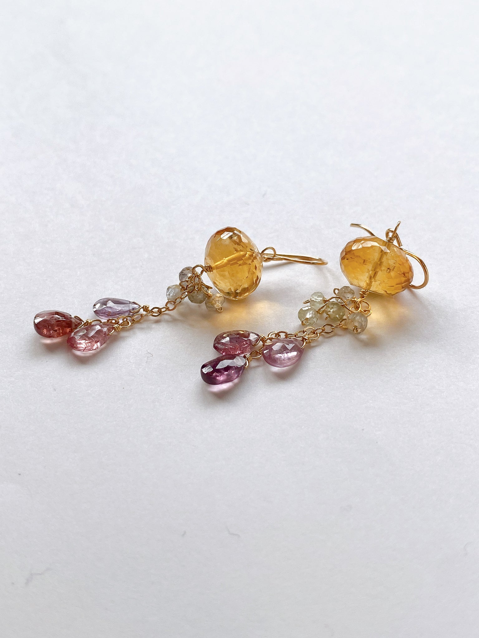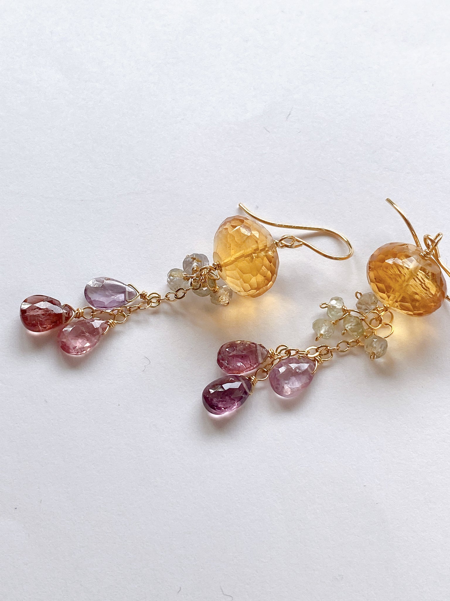 ボタンカットのシトリンとグリーンサファイア、ペアシェイプカットのスピネルを使ってデザインした耳飾りです。