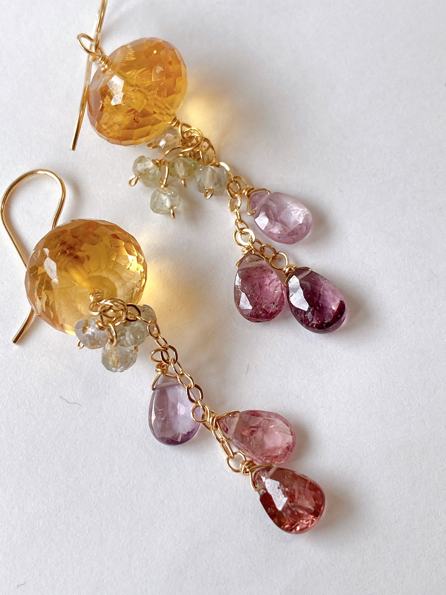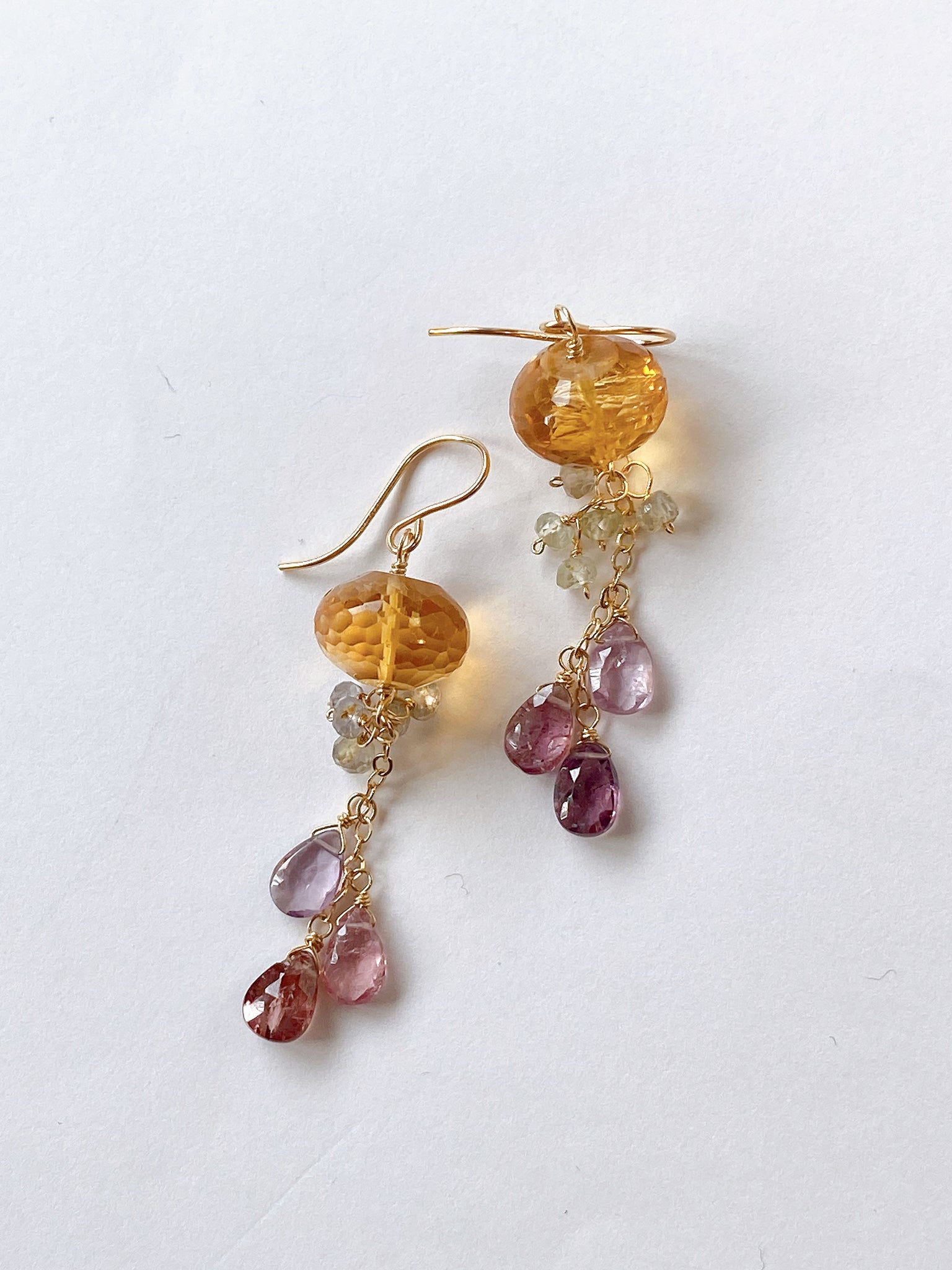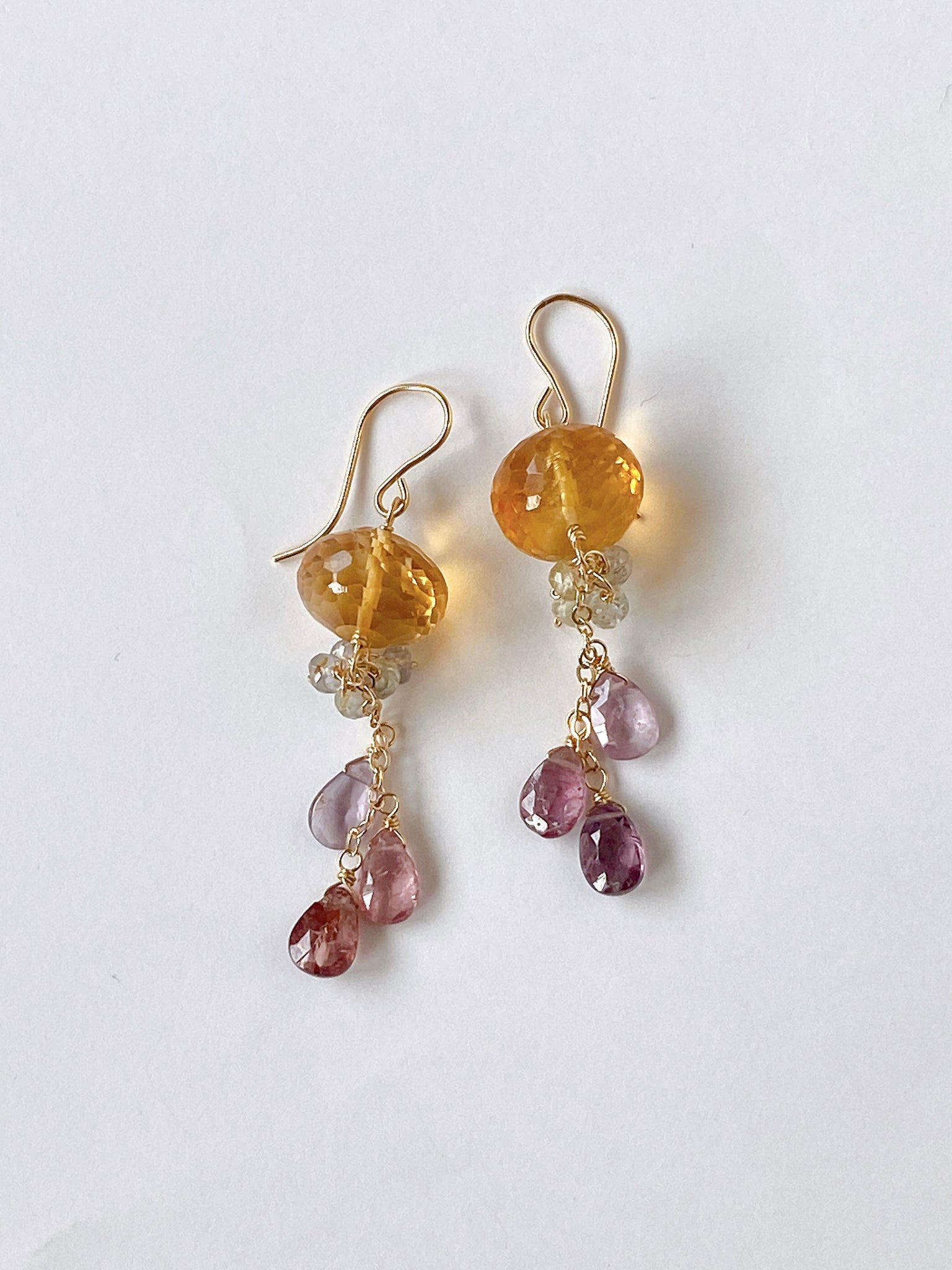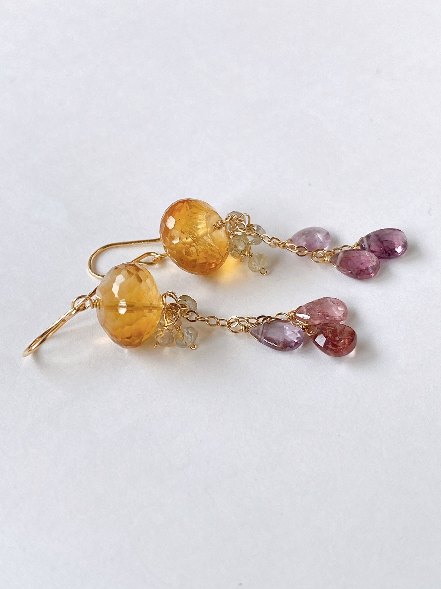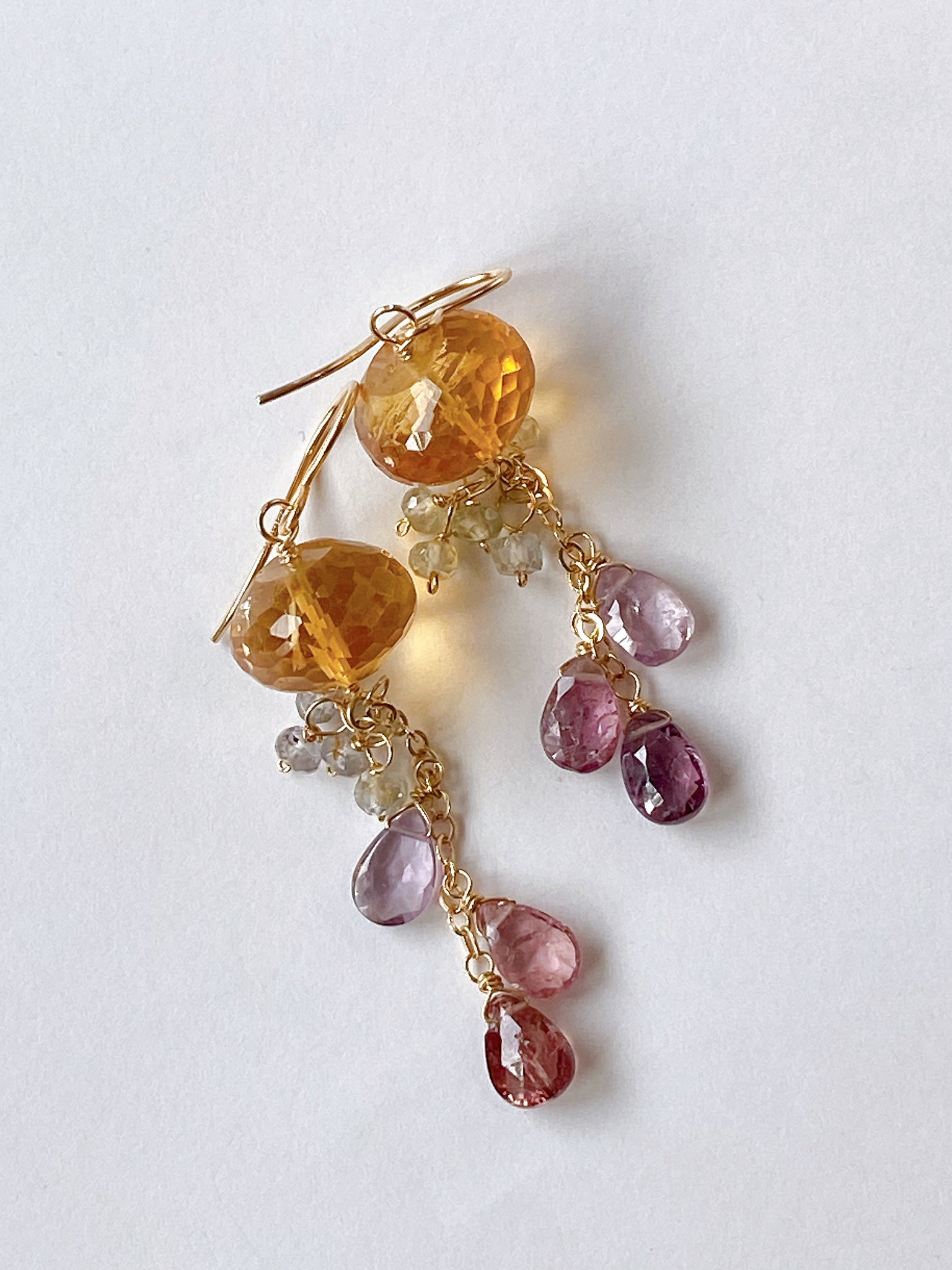 ボタンカットのシトリンとグリーンサファイア、ペアシェイプカットのスピネルを使ってデザインした耳飾りです。